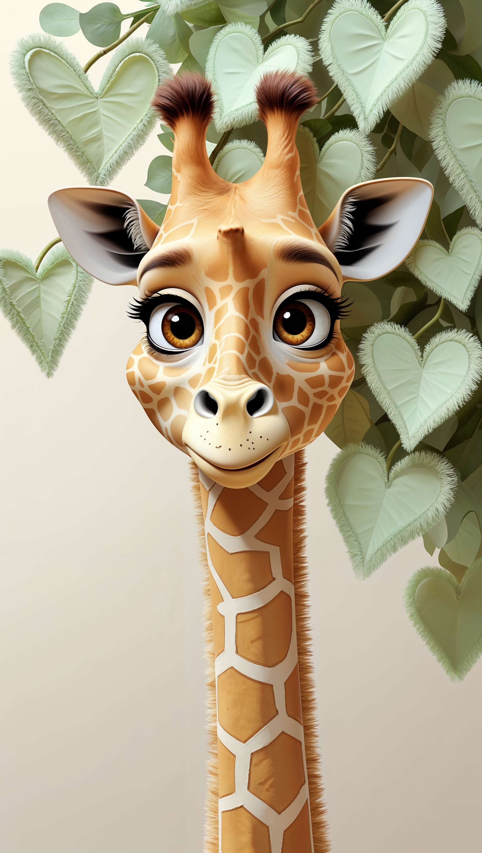1664x2944 Cute giraffe cartoon peeking behind pastel green leaves