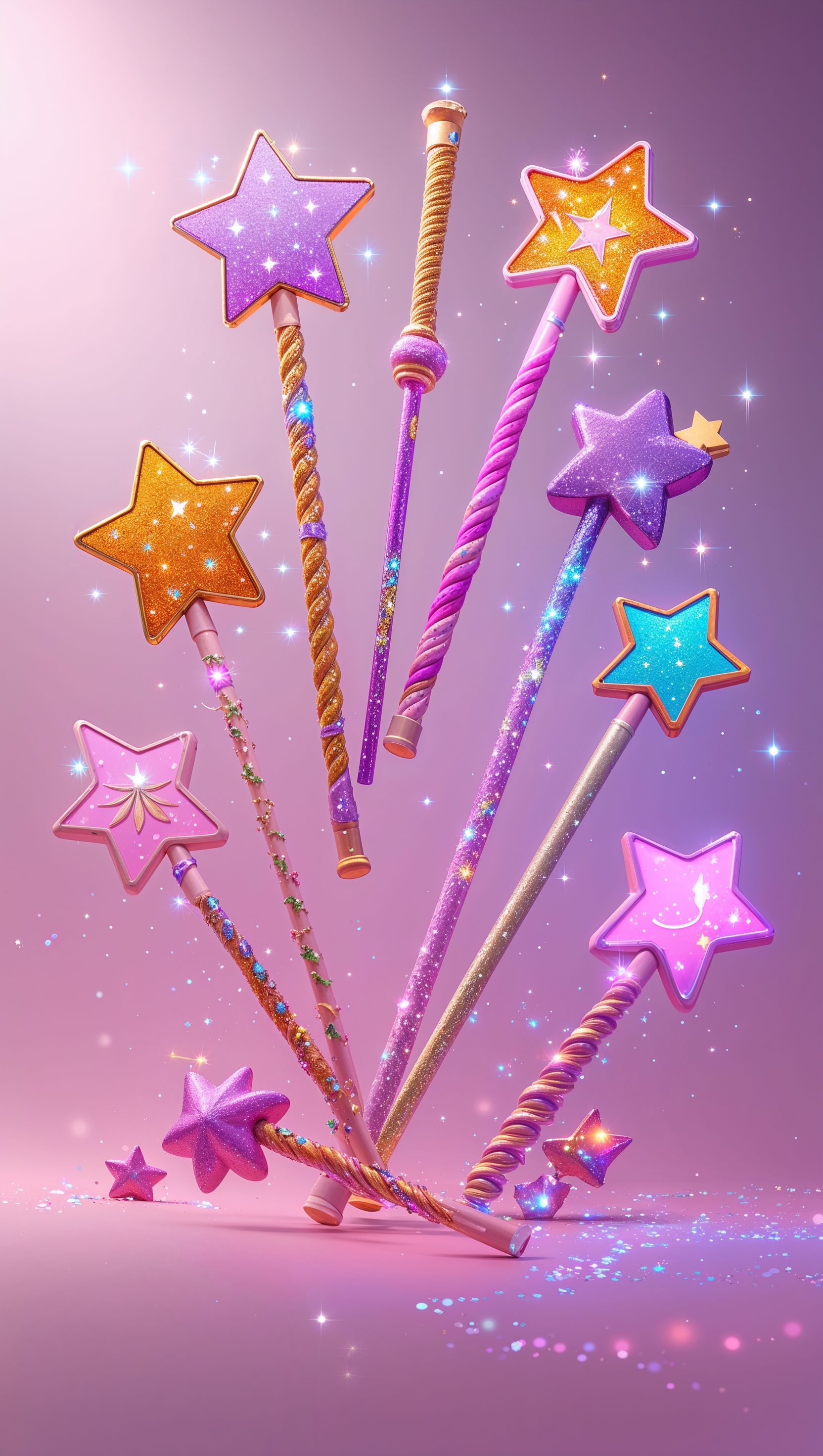 1664x2944 Cartoon fairy wands with stars and glitter on soft pink backdrop