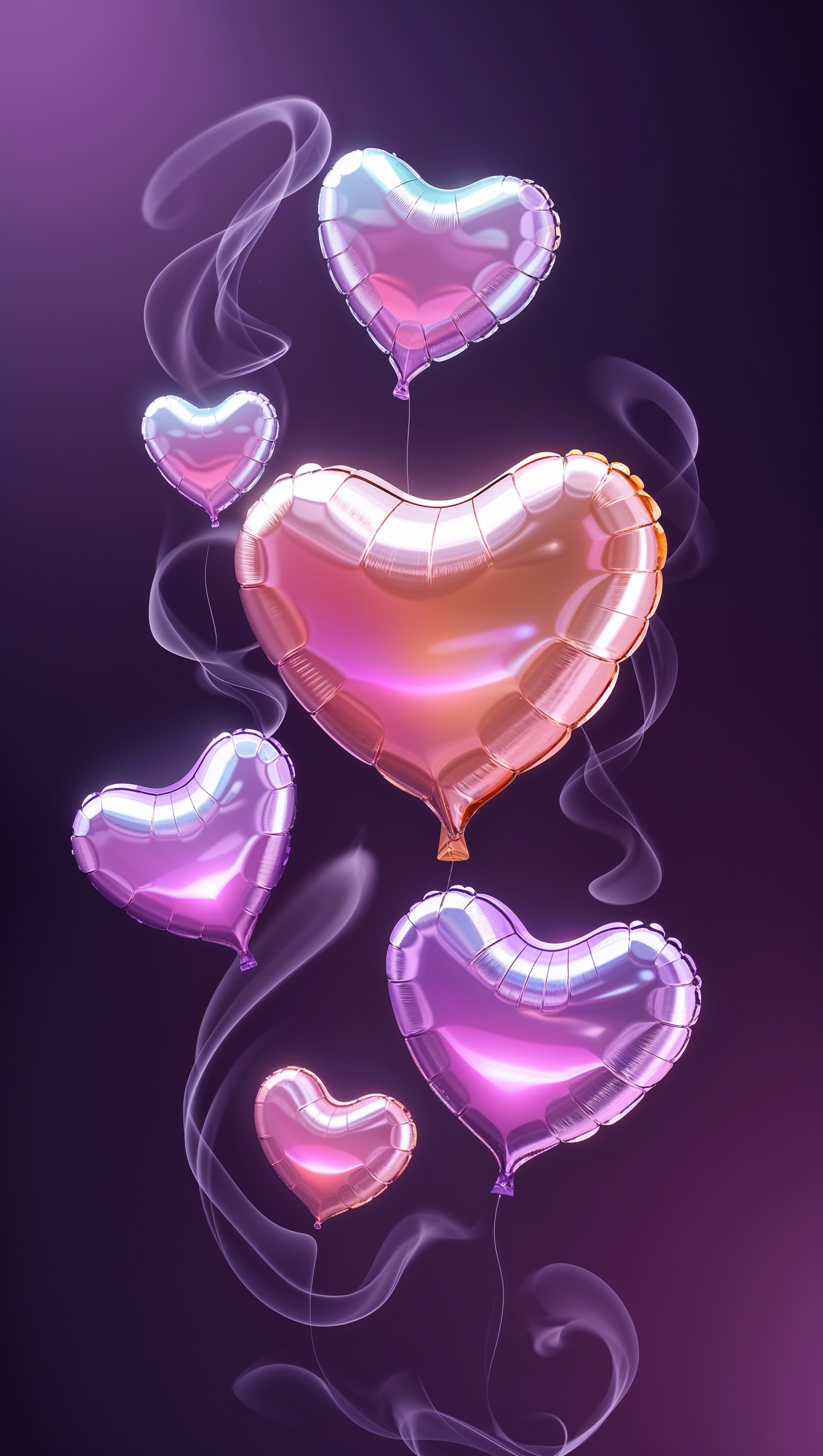 1664x2944 Glowing heart-shaped balloons floating on dark purple background