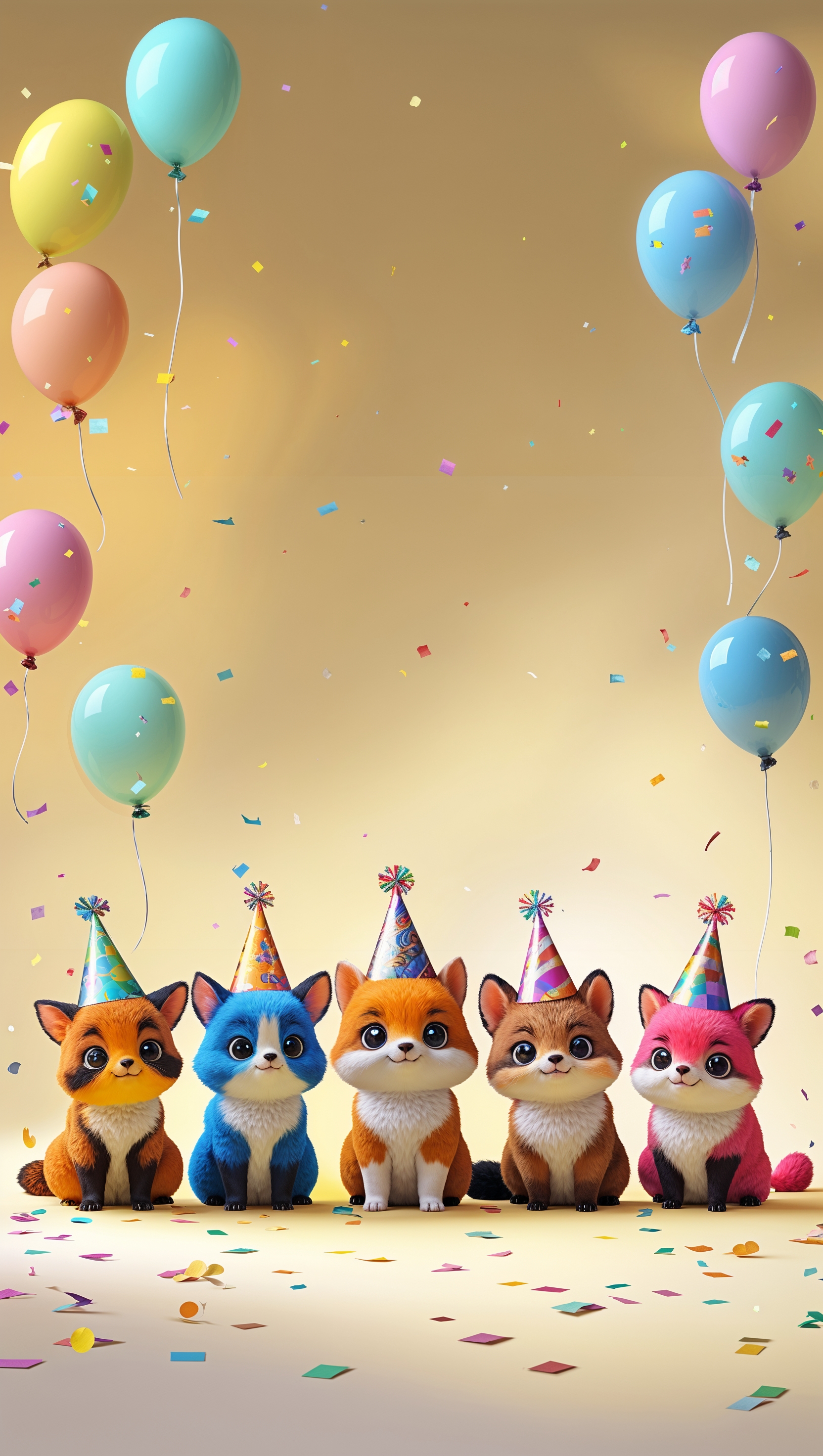 1664x2944 Chibi-style animals wearing party hats on soft yellow background
