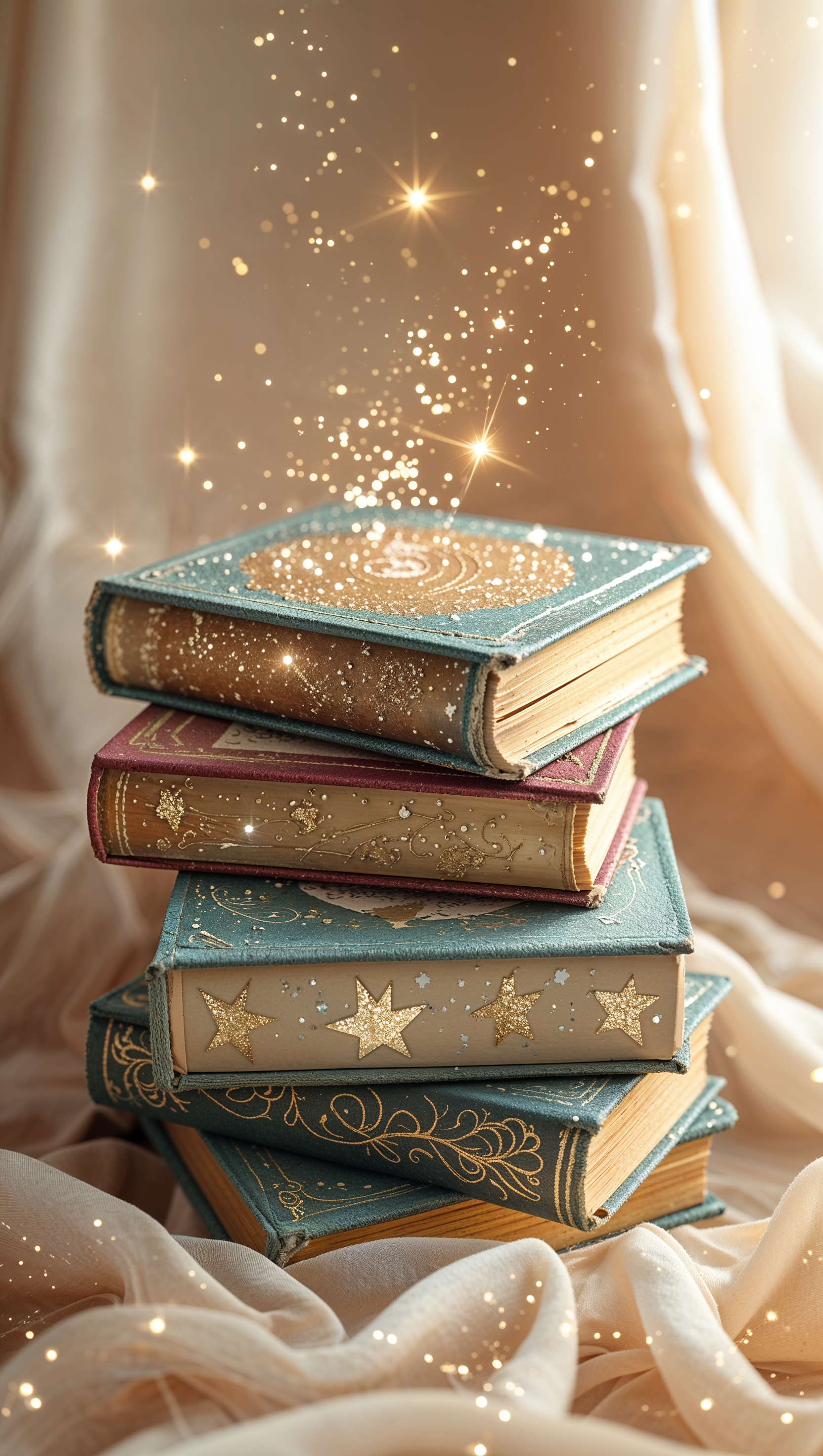1664x2944 Cute magical books with stars and sparkles on pastel cream backdrop