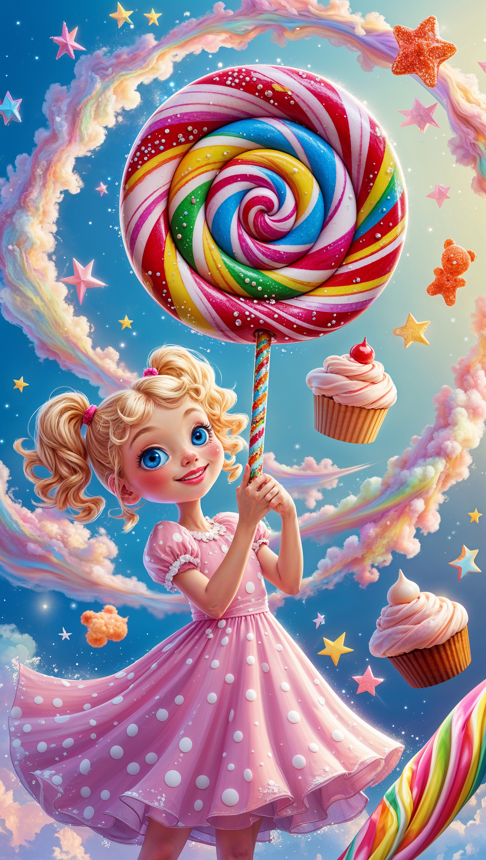 1664x2944 Cartoon girl holding a giant lollipop surrounded by candy and stars