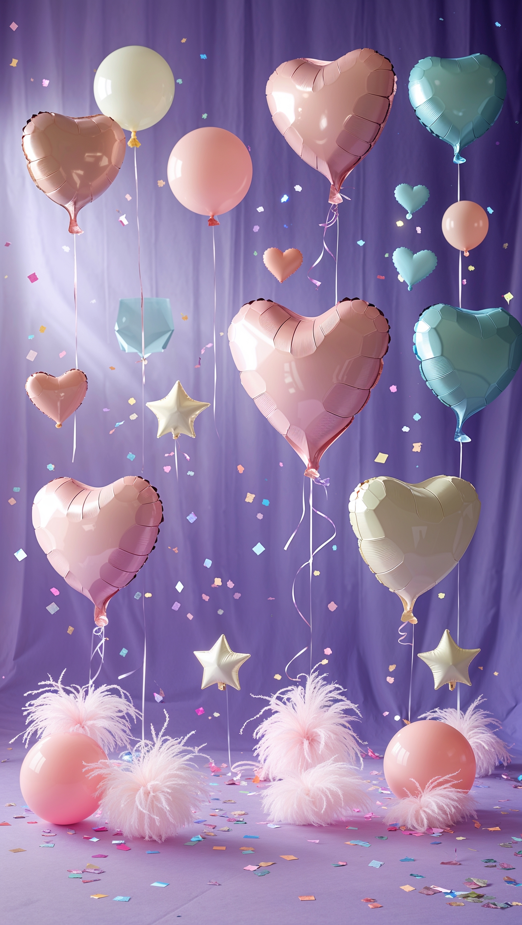 1664x2944 Soft purple background with floating balloons and confetti, girly party vibe