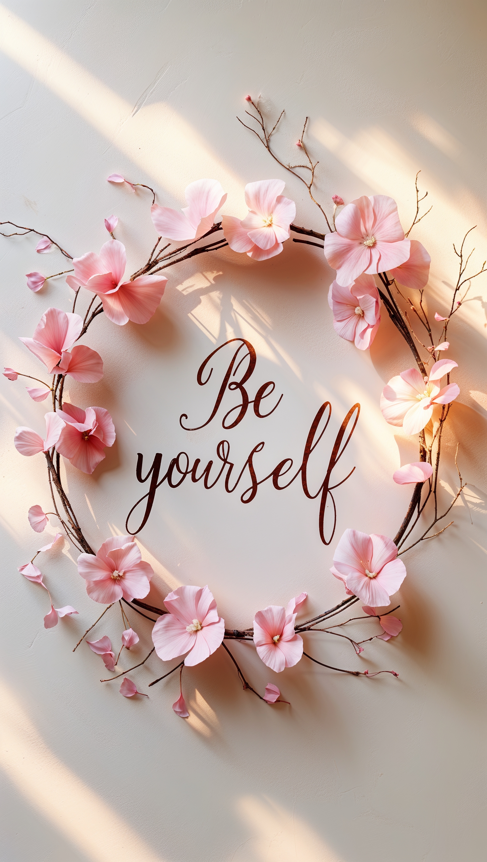 1664x2944 Pink floral wreath framing a delicate handwritten quote "Be yourself"