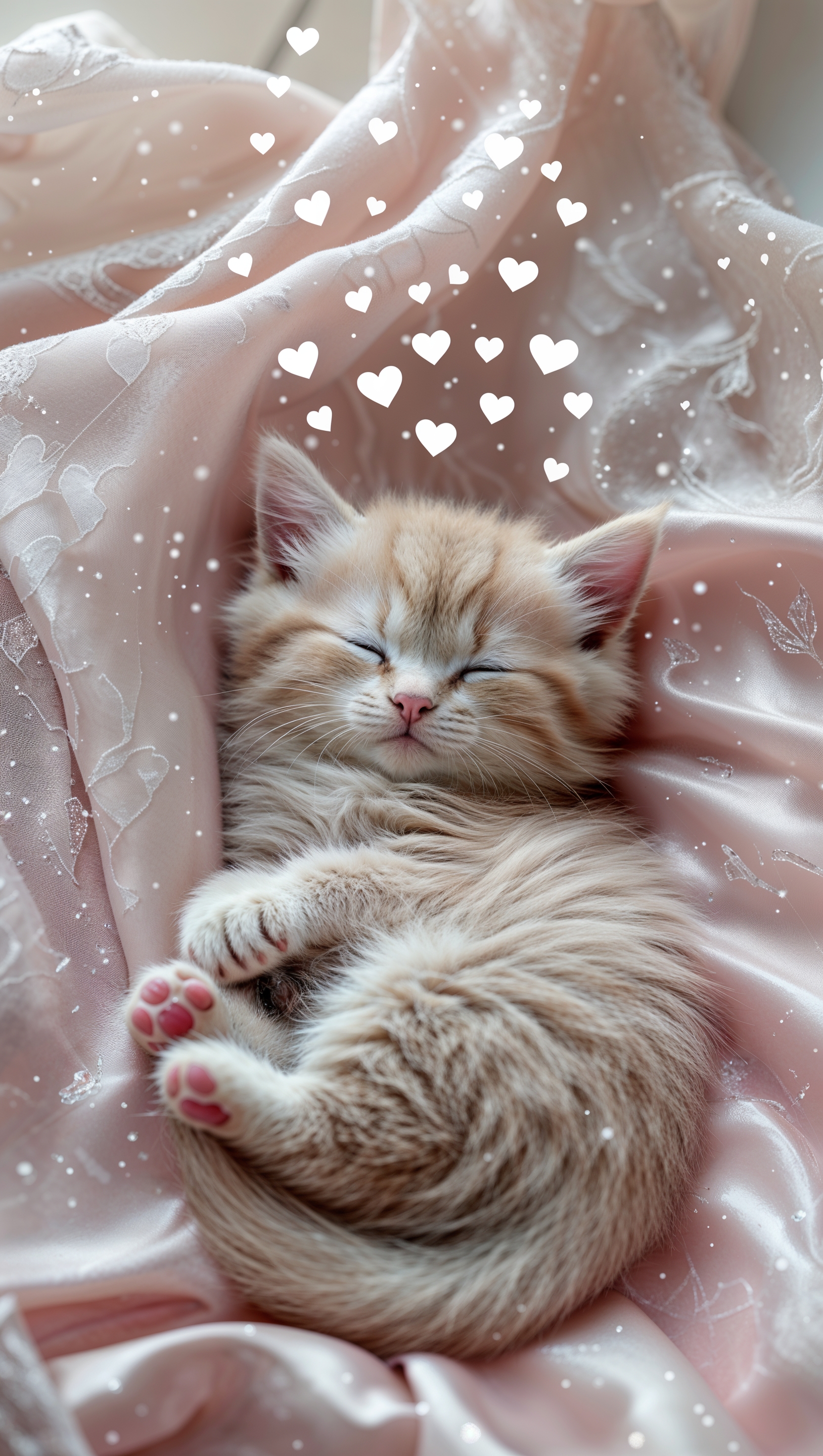 1664x2944 Cute kitten sleeping on a pastel blanket with hearts floating above