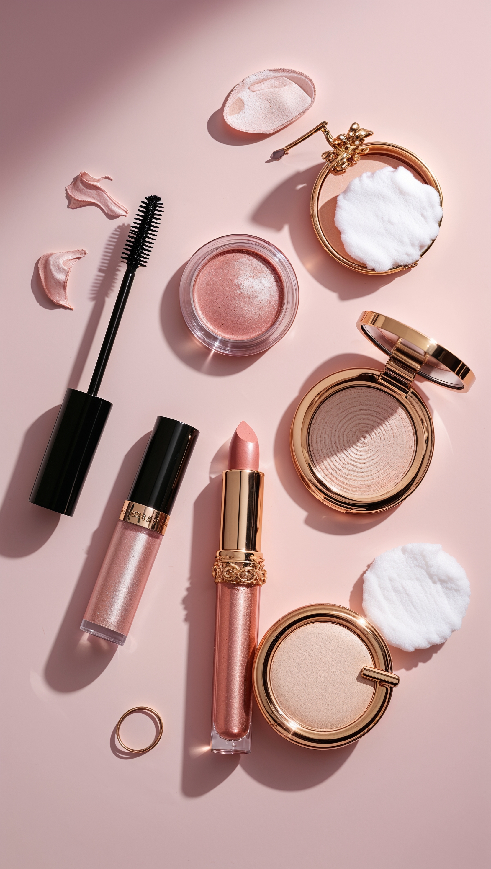 1664x2944 Girly makeup essentials flat lay with soft pink background
