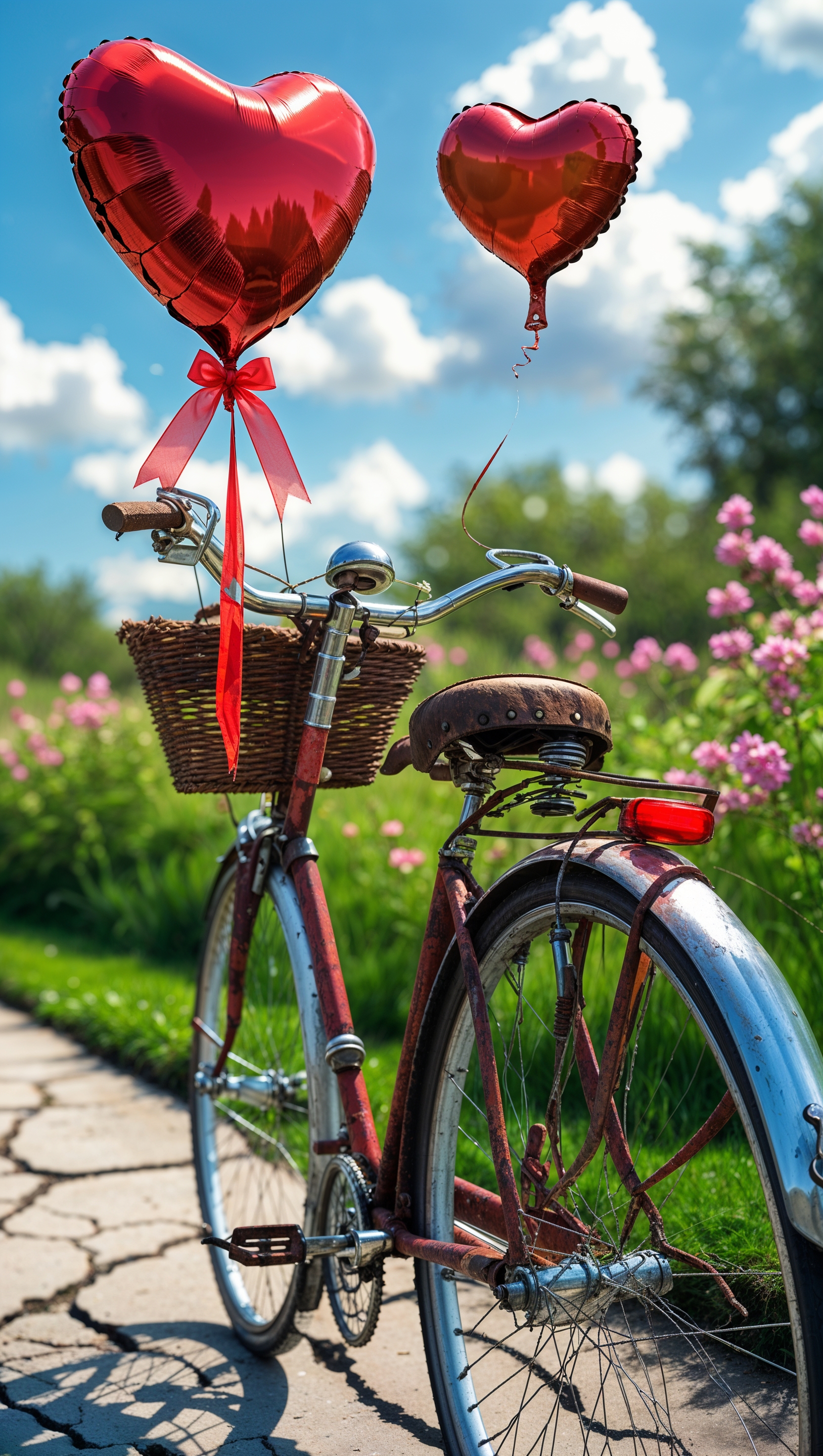 1664x2944 Heart-shaped balloons tied to a vintage bicycle on a sunny day