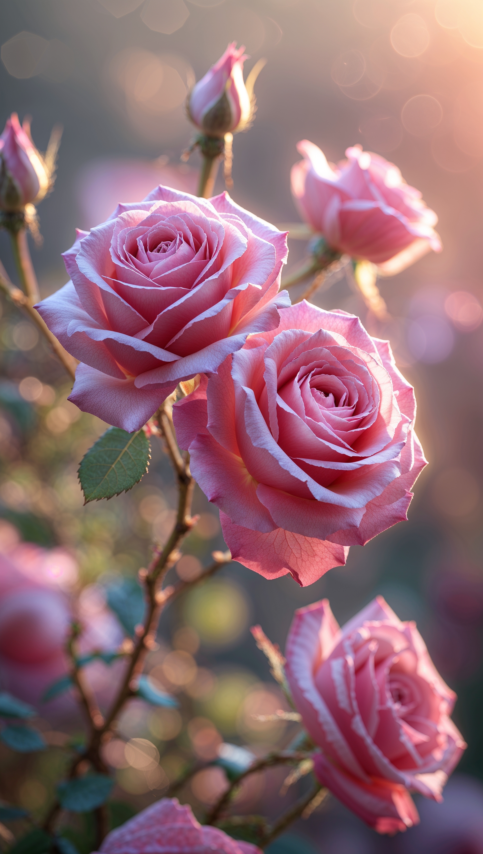 1664x2944 Close-up of pink roses with soft sunlight and gentle bokeh background