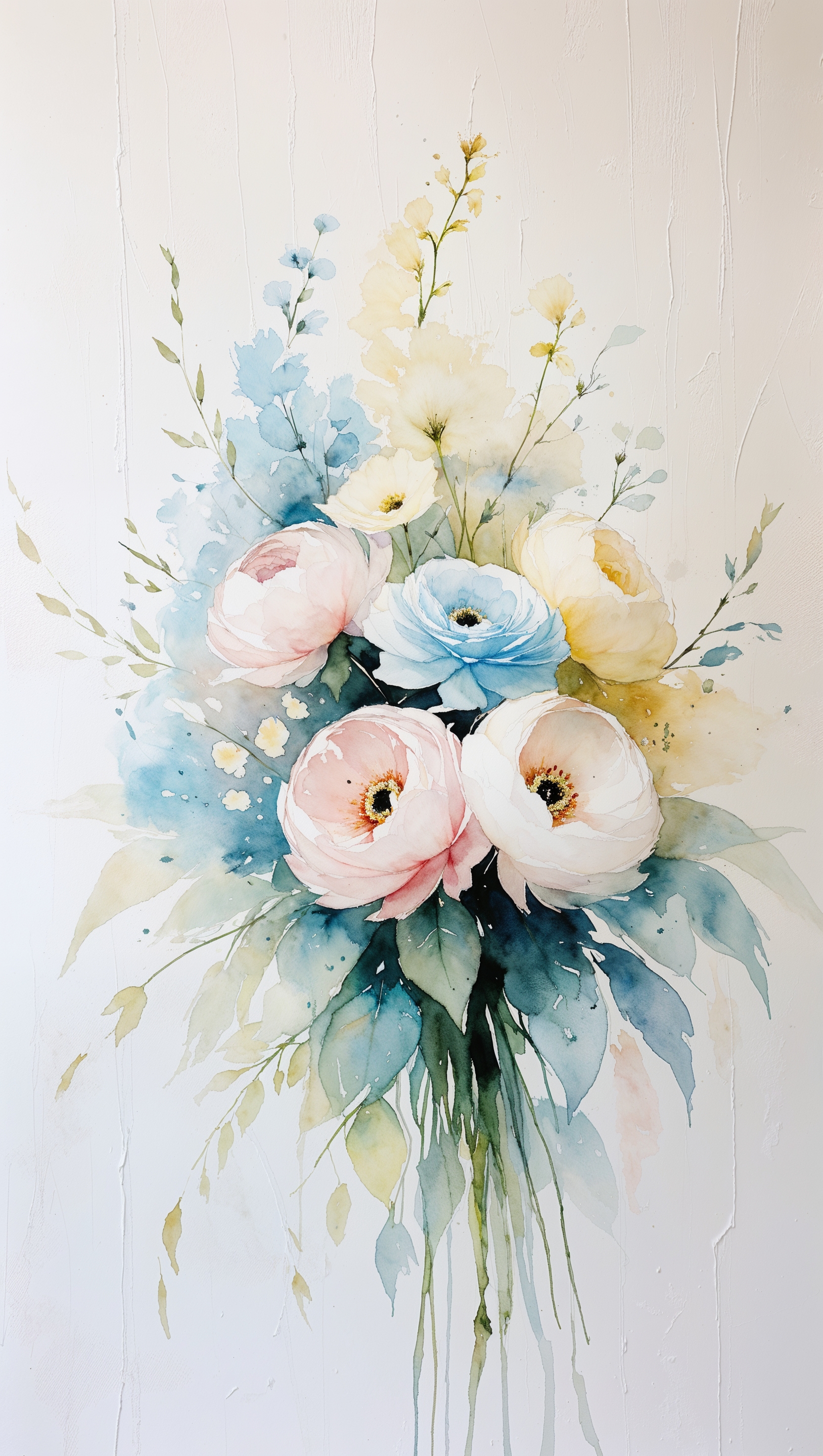 1664x2944 Watercolor floral bouquet in pastel tones on white vertical background
