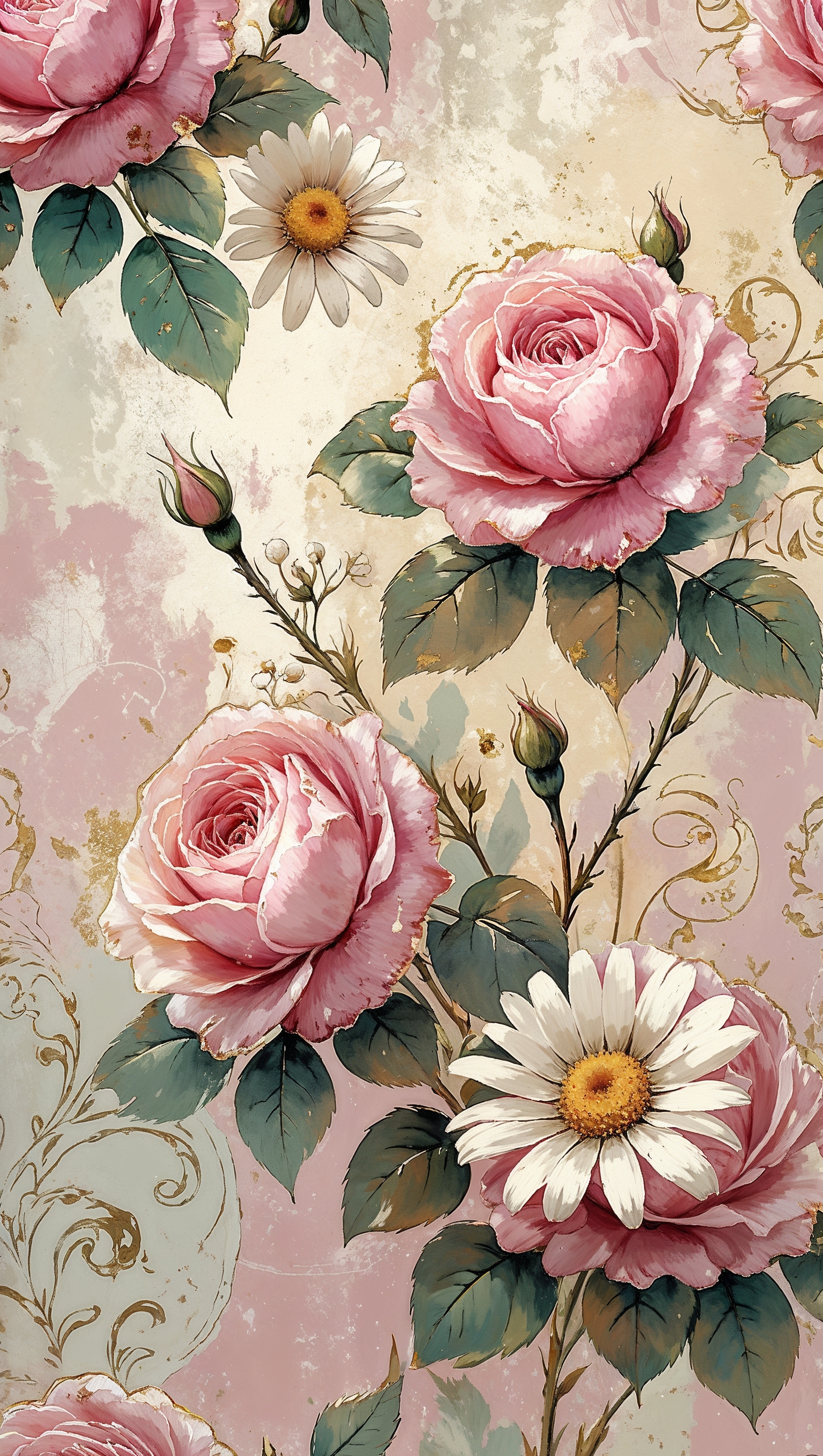 1664x2944 Vintage floral wallpaper with roses and daisies in muted pink and cream