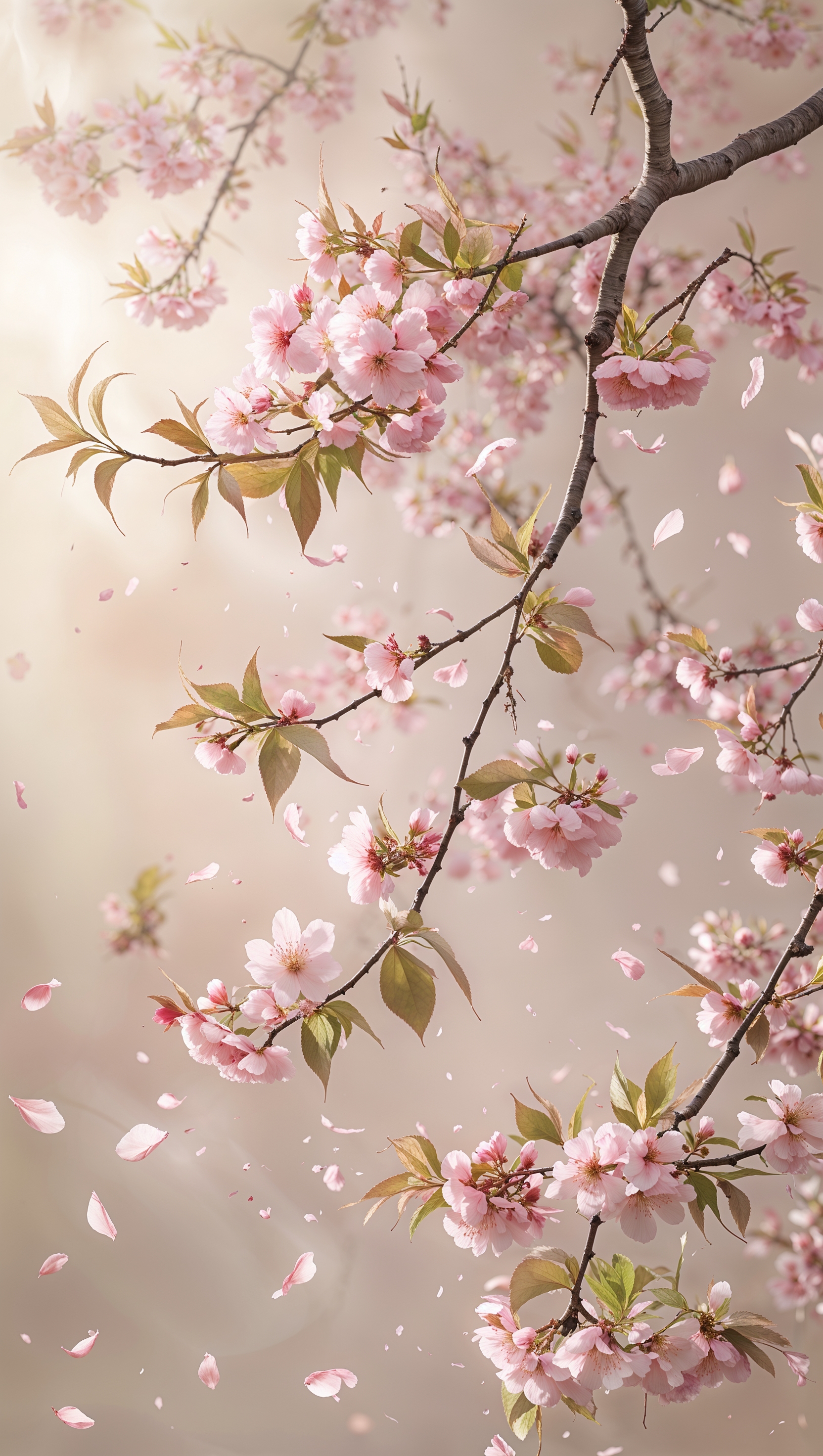1664x2944 Delicate cherry blossom branches with falling petals on soft pink