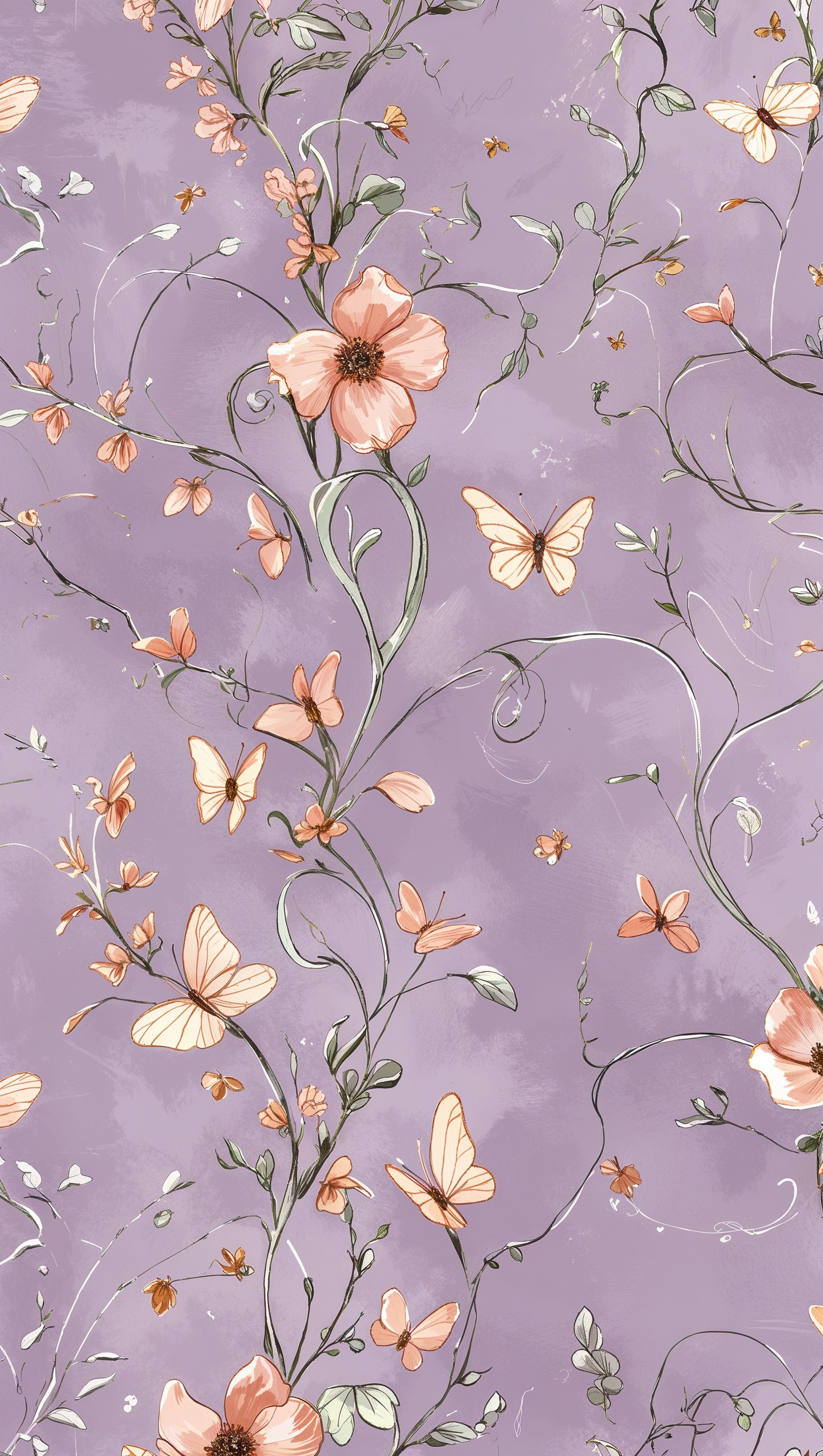 1664x2944 Hand-drawn floral pattern with tiny butterflies on pastel lilac
