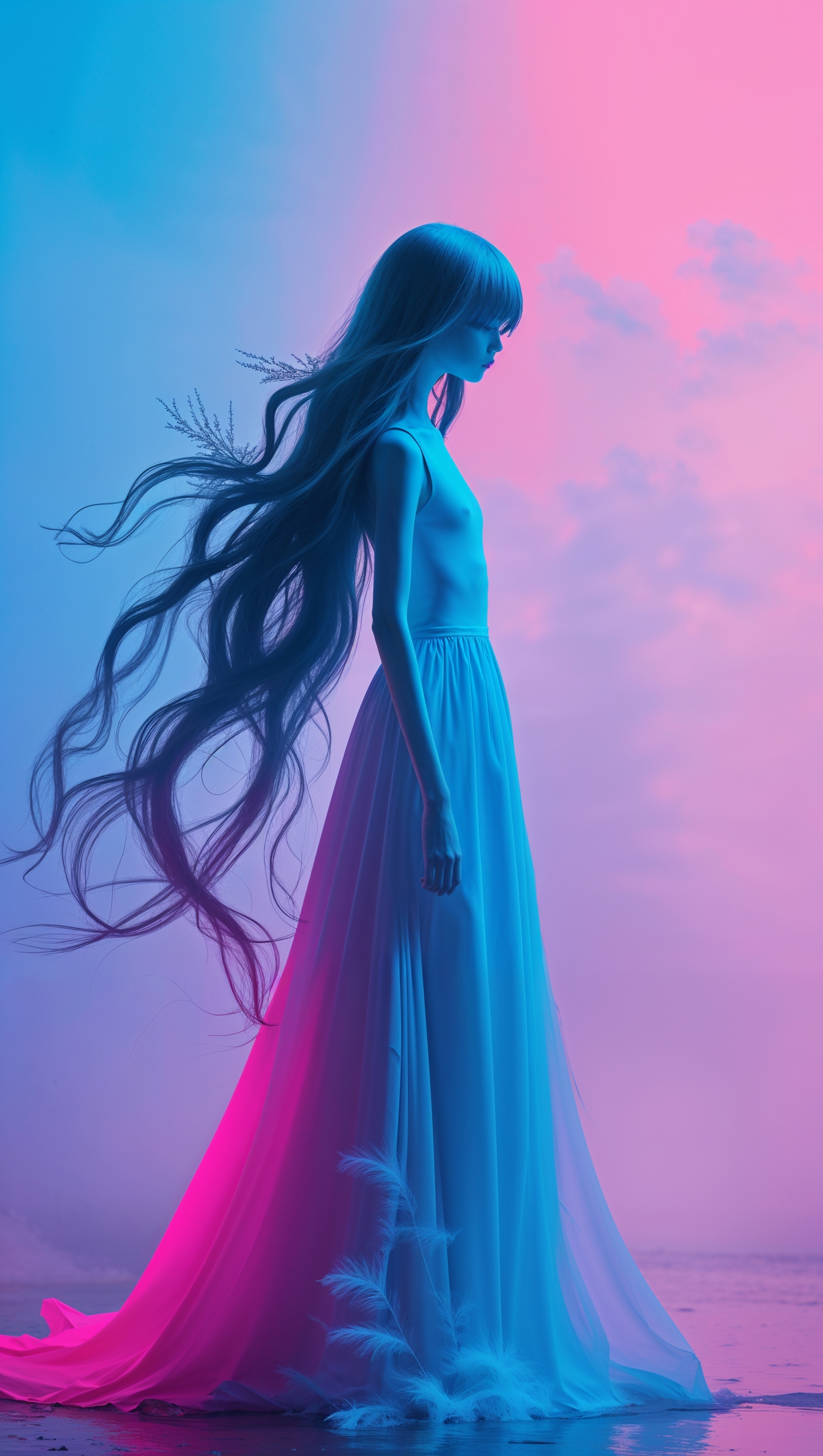 1664x2944 Girl silhouette with flowing hair in neon blue and pink gradient background