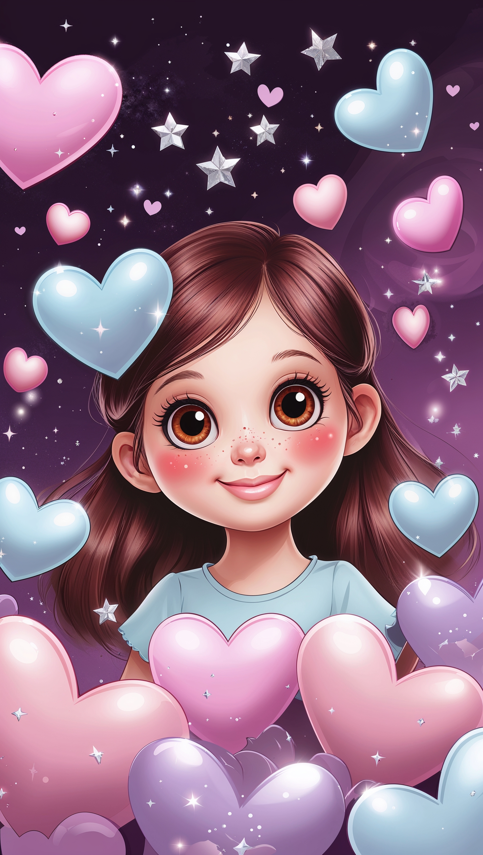 1664x2944 Cute cartoon girl surrounded by floating hearts and stars on dark purple