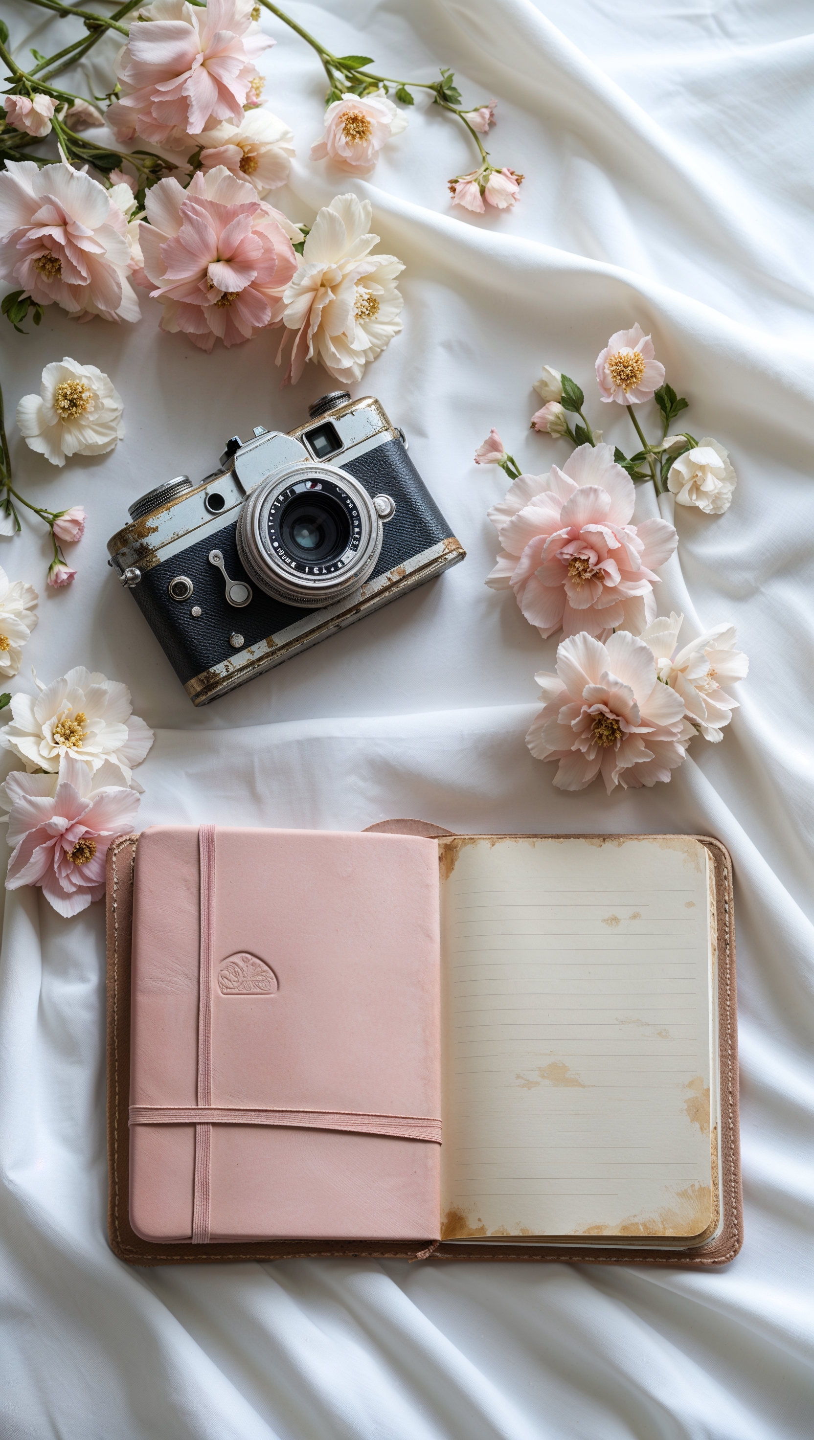 1664x2944 Flat lay of vintage camera, flowers, and pink notebook on white sheet