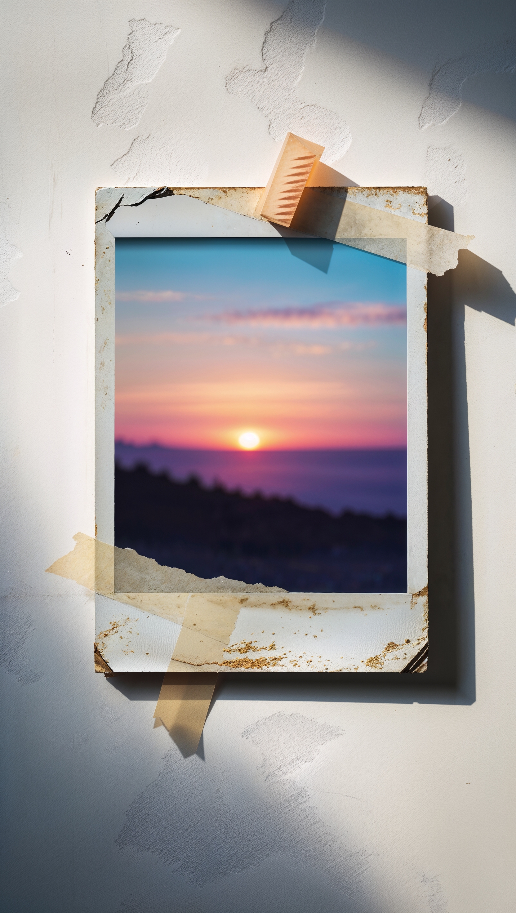 1664x2944 Polaroid frame mockup with soft sunset view inside, taped on white wall