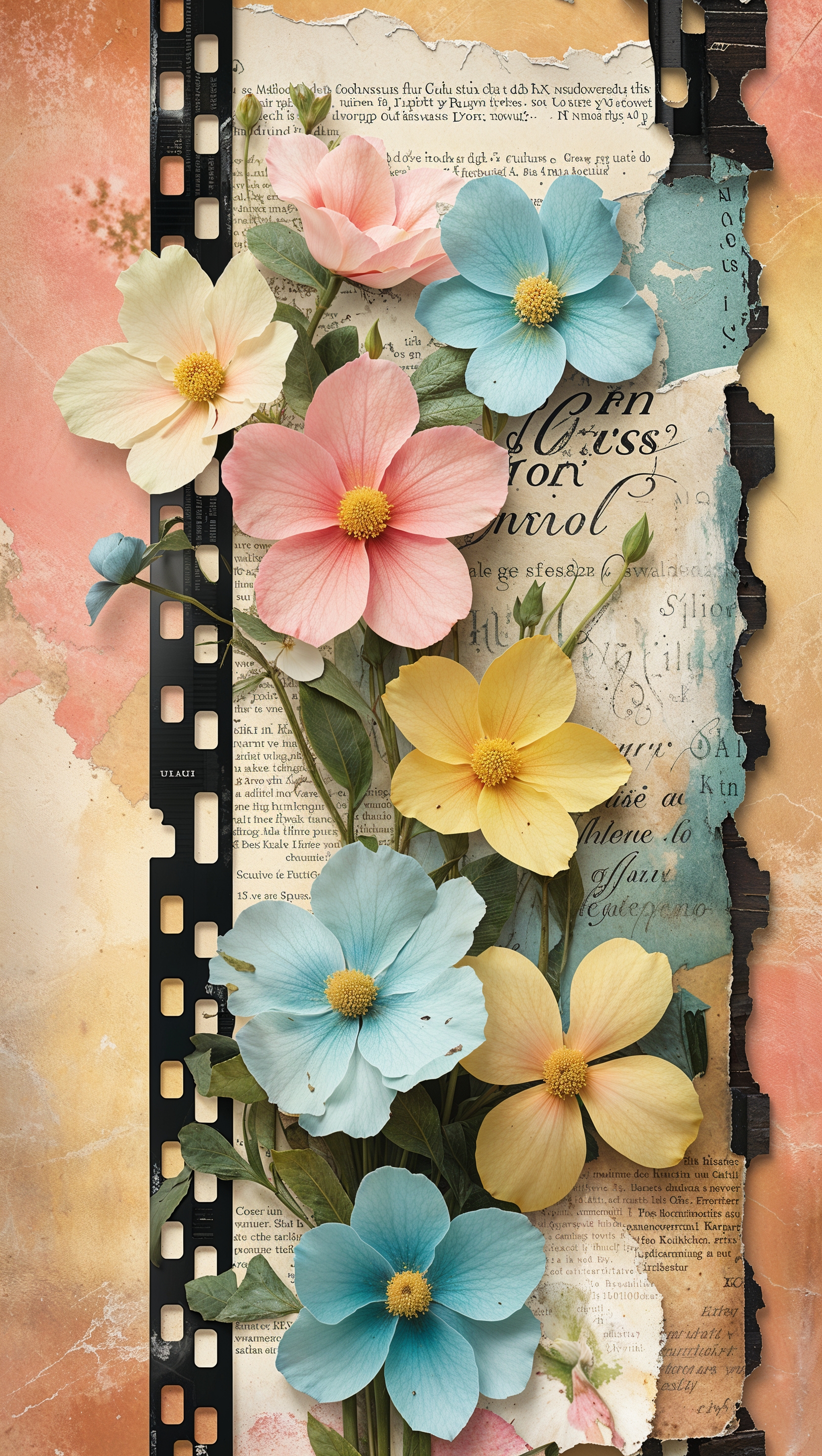 1664x2944 Retro collage of flowers, film strips, and old text snippets