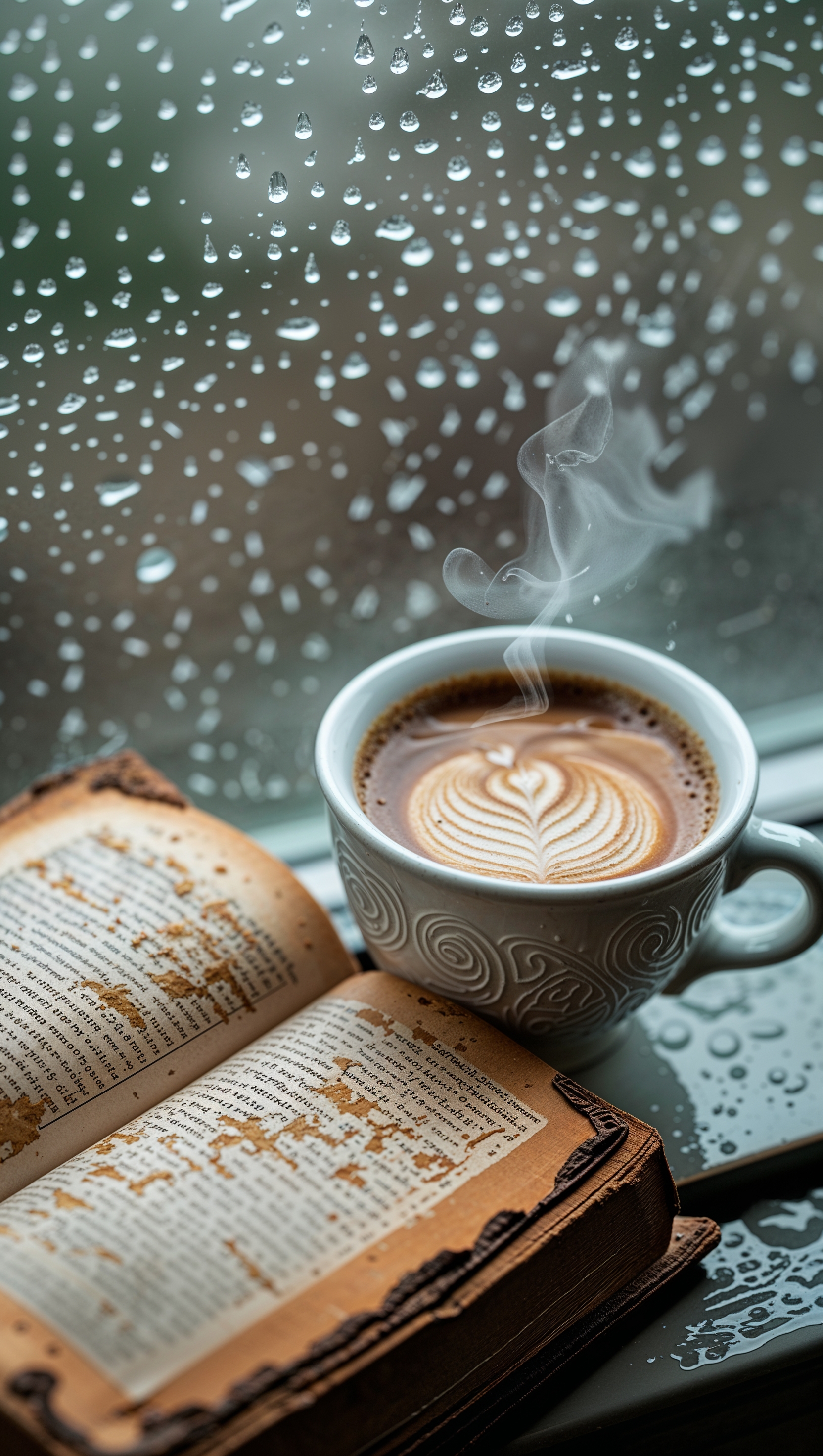 1664x2944 Soft-focus photo of open book and coffee on a rainy window sill