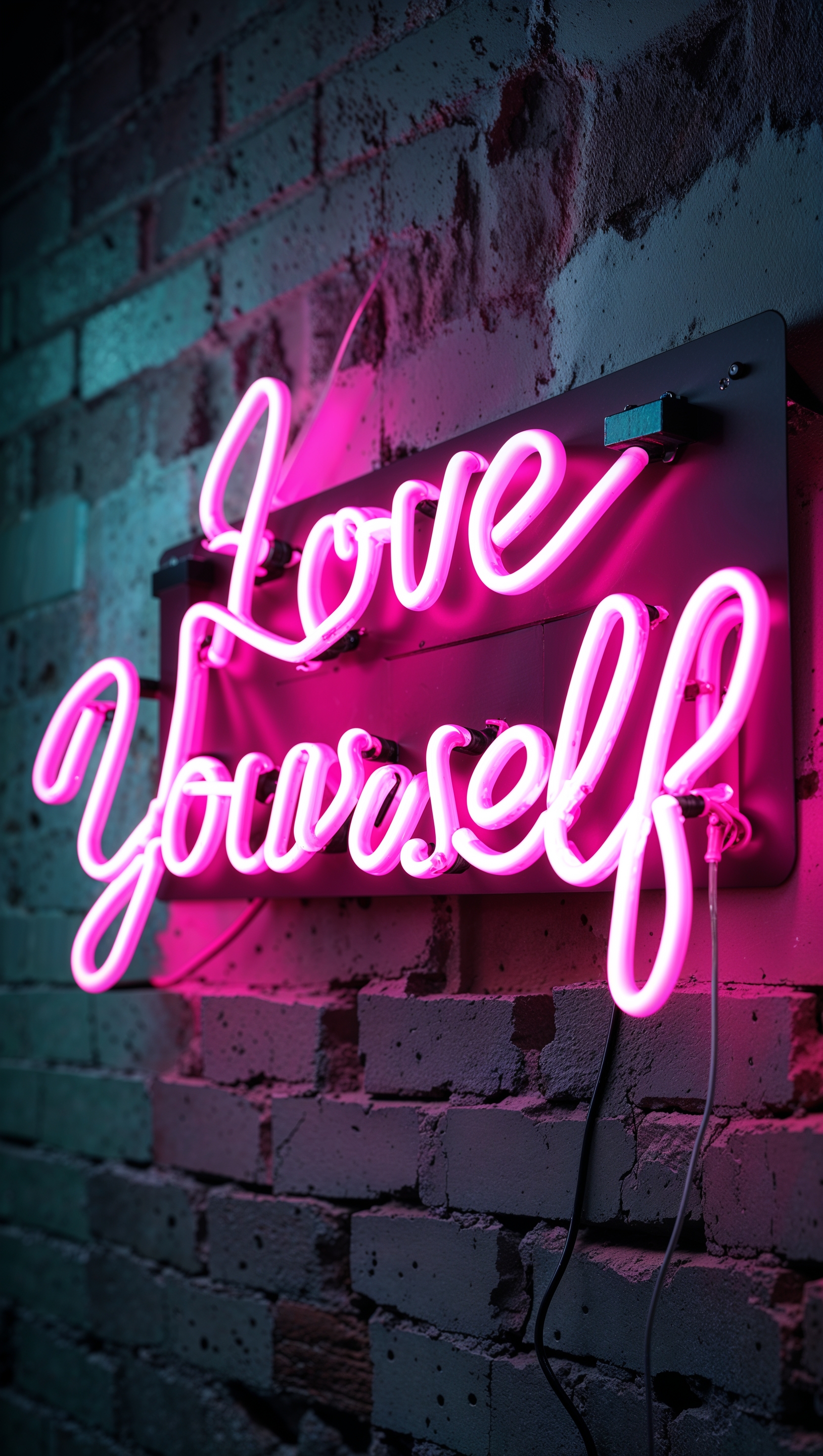 1664x2944 Pink neon sign saying “love yourself” on a brick wall