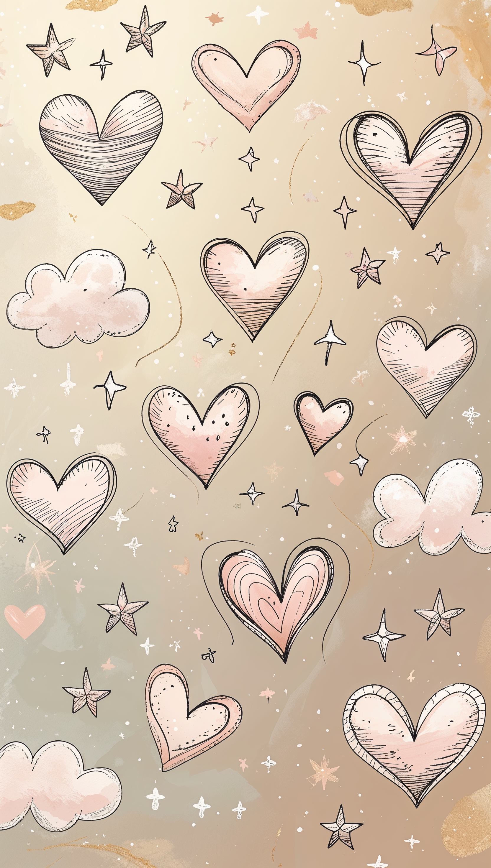 1664x2944 Aesthetic doodles of hearts, stars, and clouds on pale background