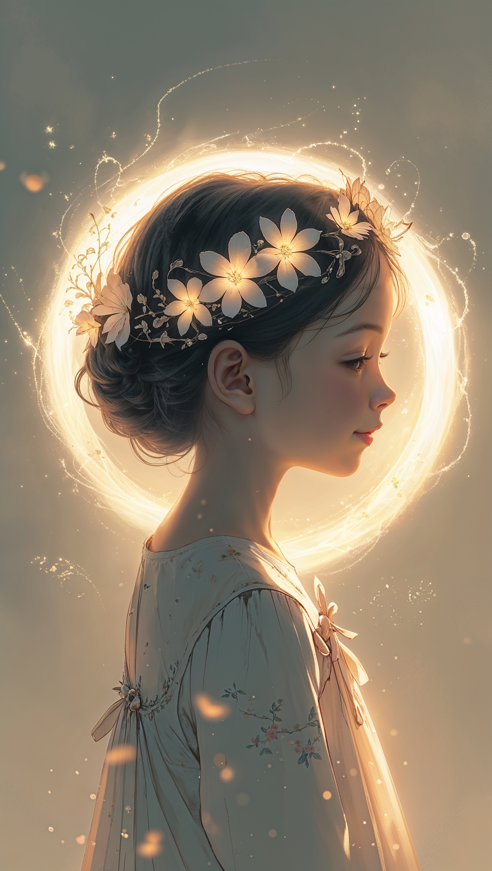 1664x2944 Girl silhouette with flower head and glowing halo, dreamy vibe