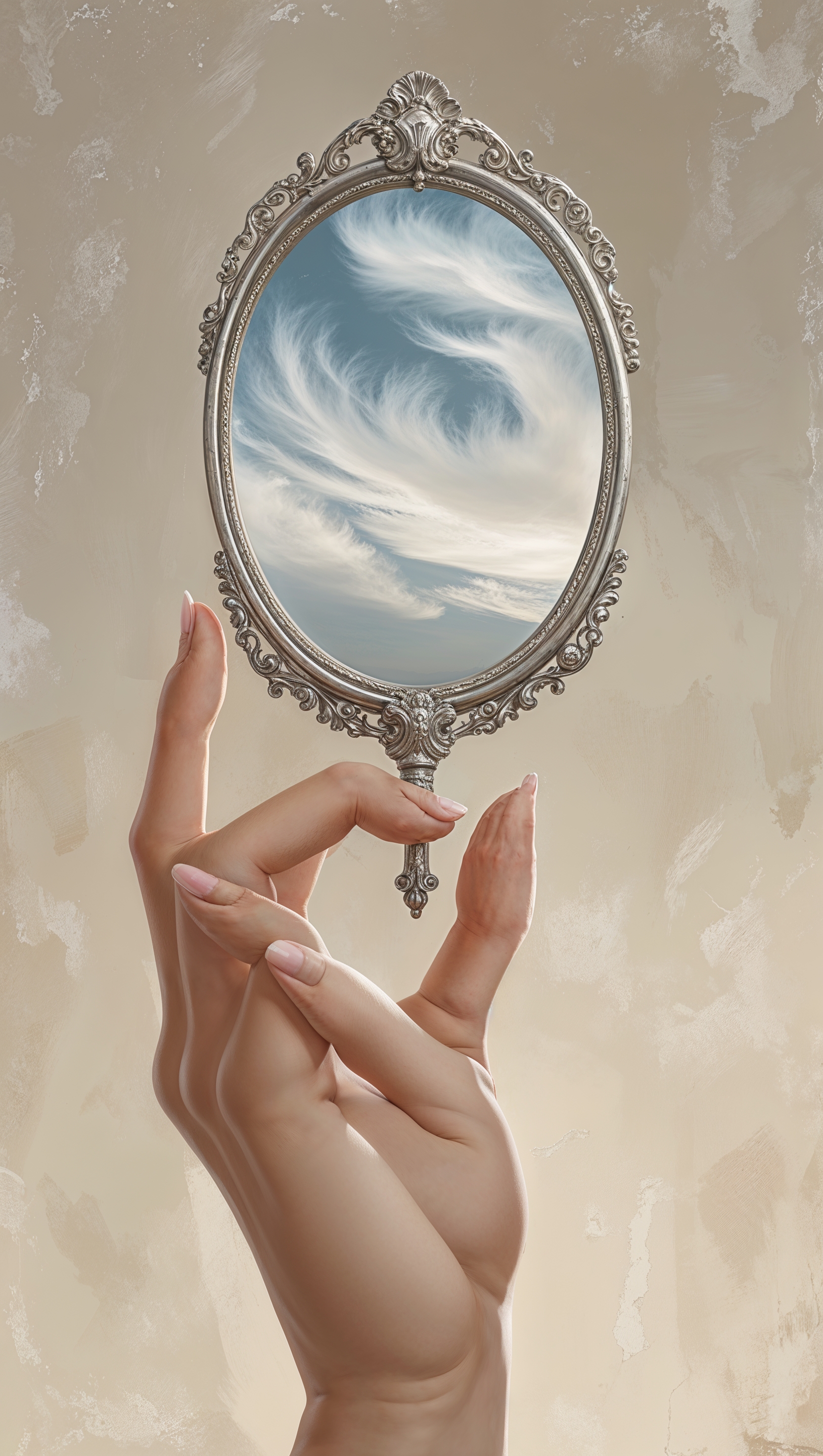 1664x2944 Hand holding a mirror reflecting cloudy sky, symbolic vertical shot