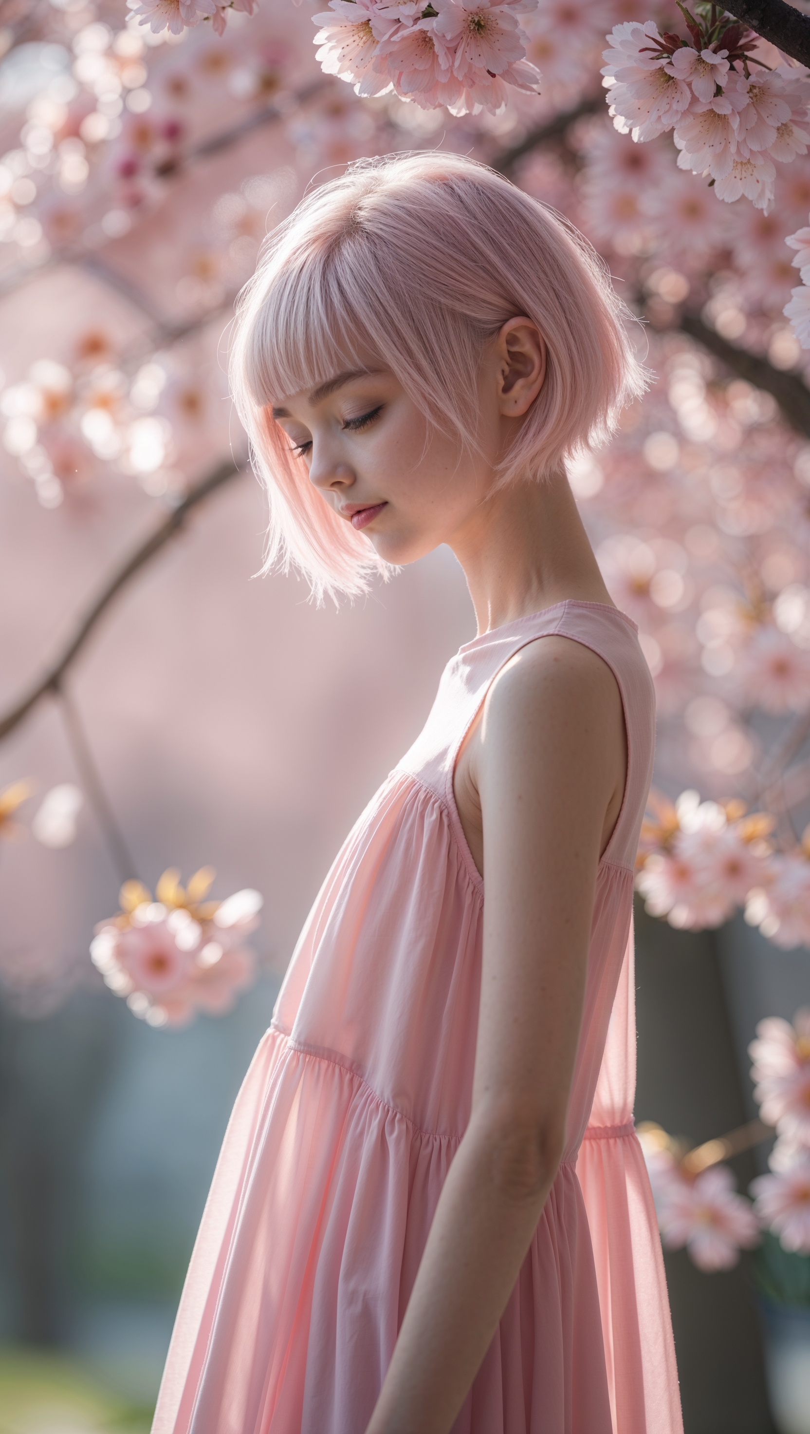 1664x2944 Aesthetic girl with short hair standing under cherry blossoms, soft pink tones, vertical iPhone format