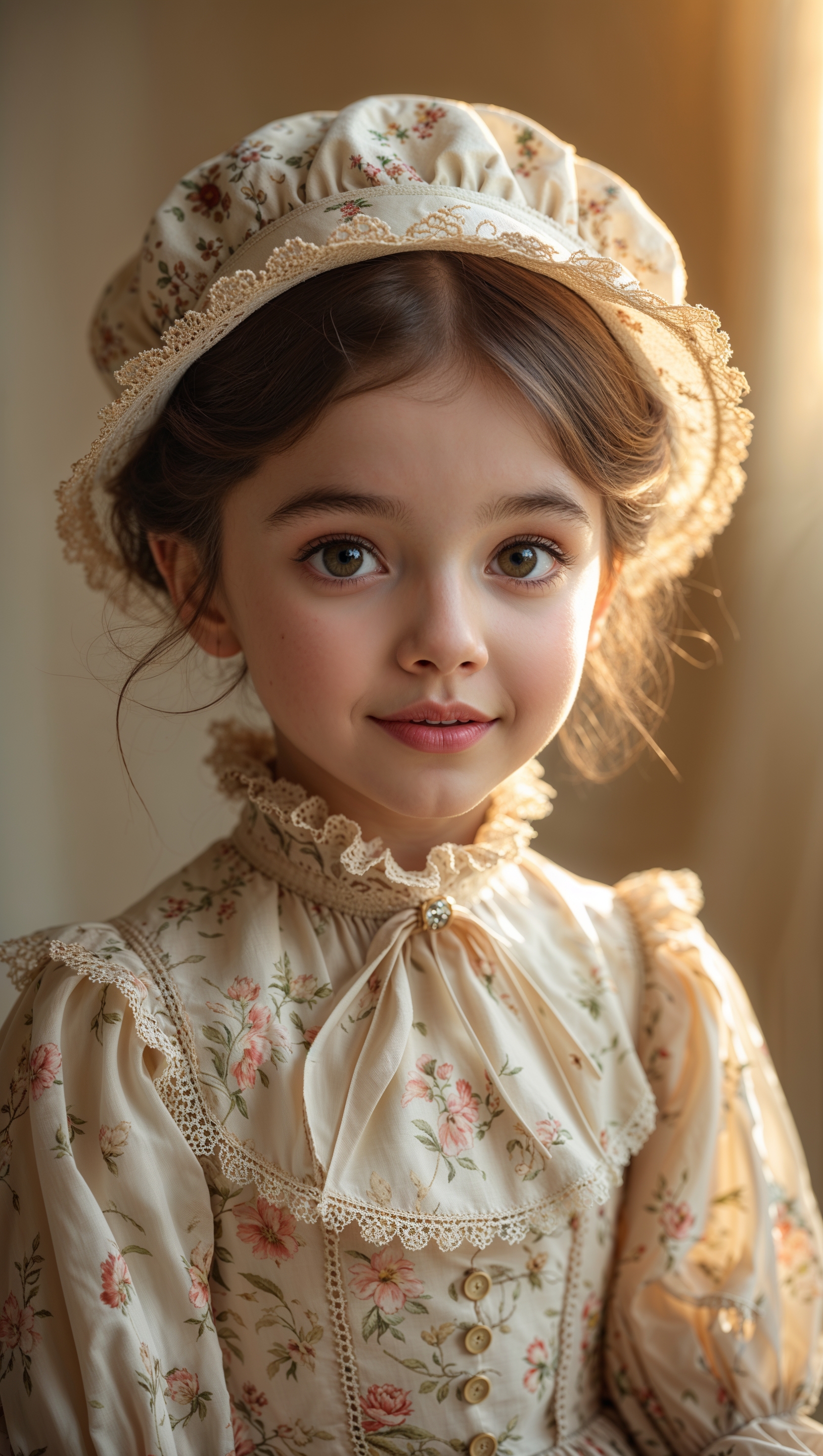 1664x2944 Portrait of a girl in vintage clothes with soft sunlight and film grain effect