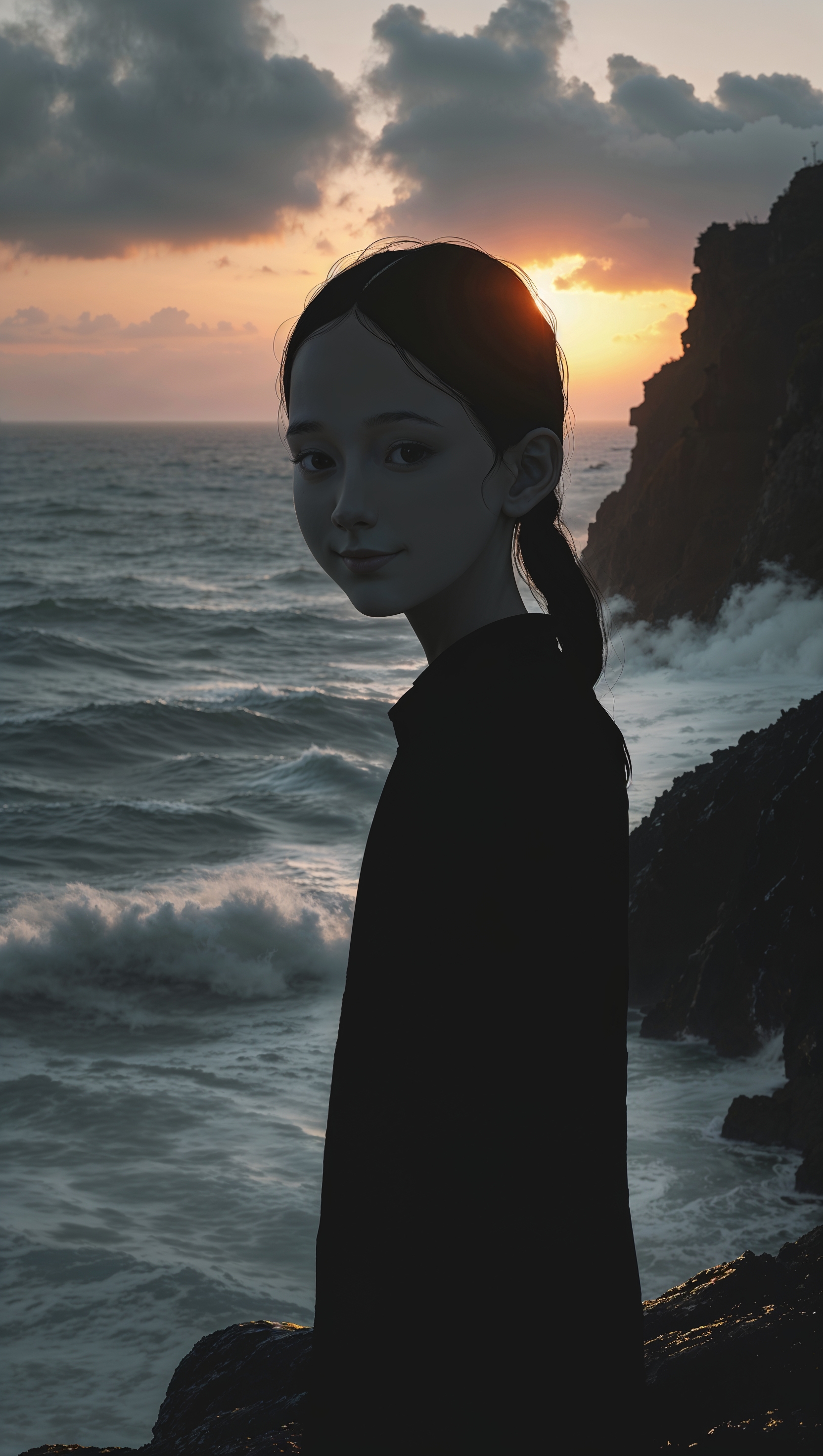 1664x2944 Minimalist black and white silhouette of a girl facing the sea at sunset