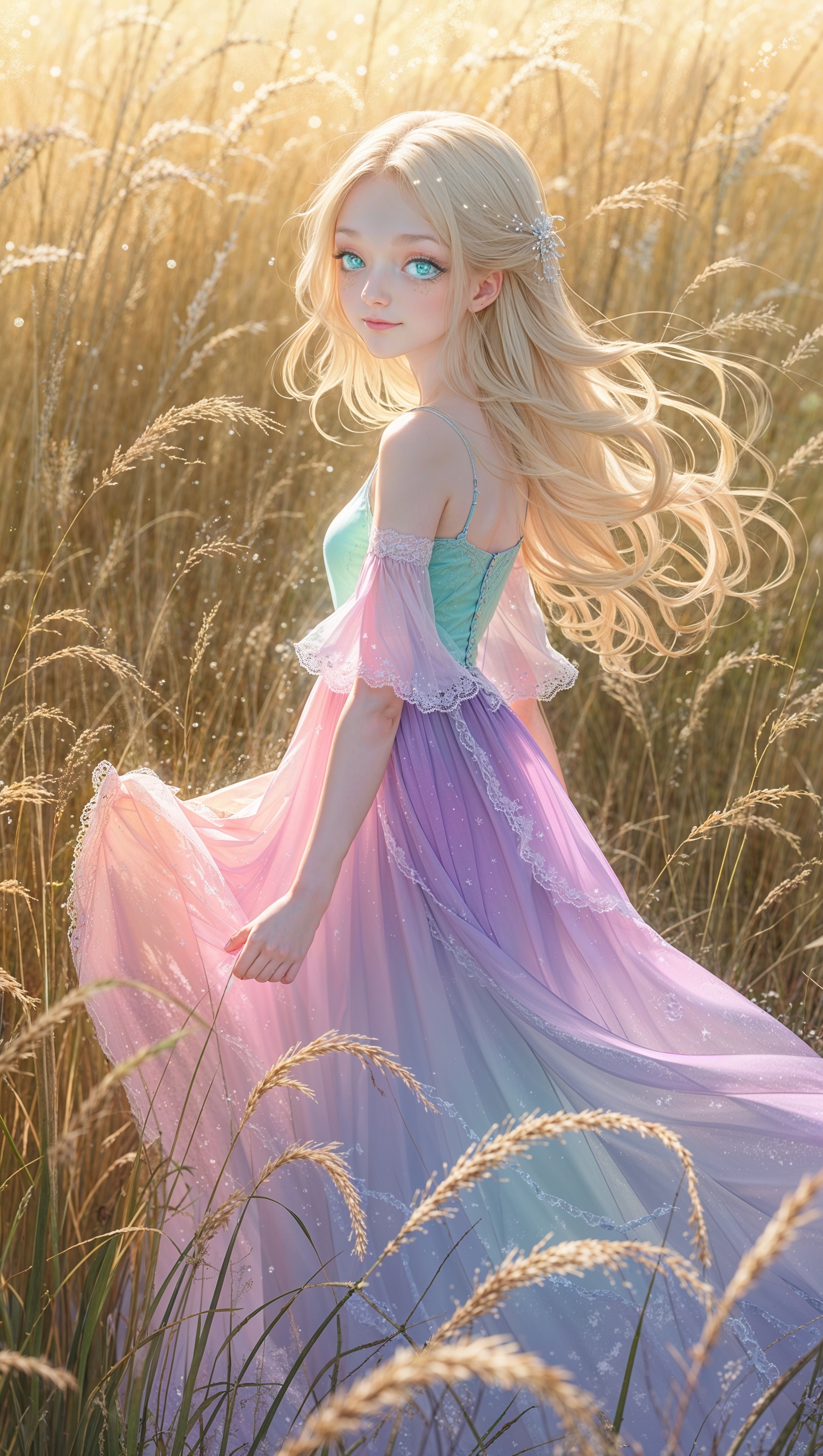 1664x2944 Anime-style girl in a flowing dress standing in a field of tall grass