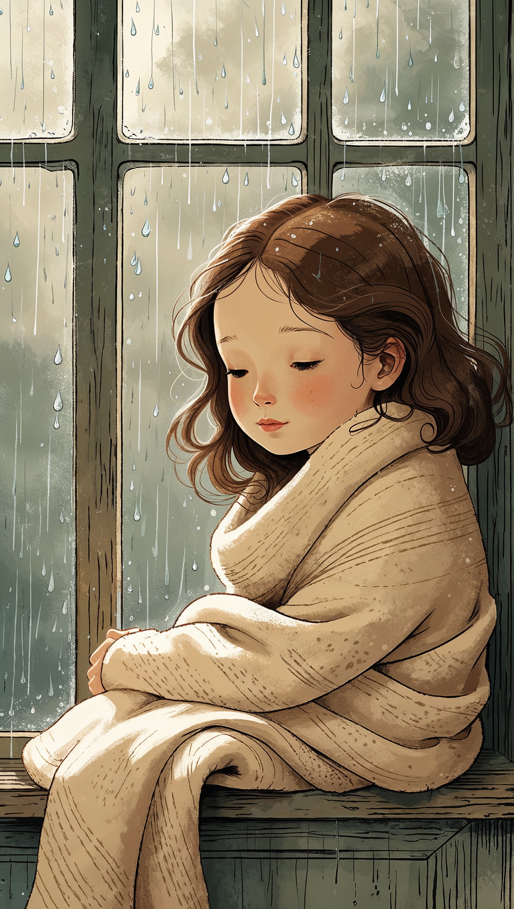1664x2944 Illustration of girl sitting on windowsill watching the rain, cozy atmosphere