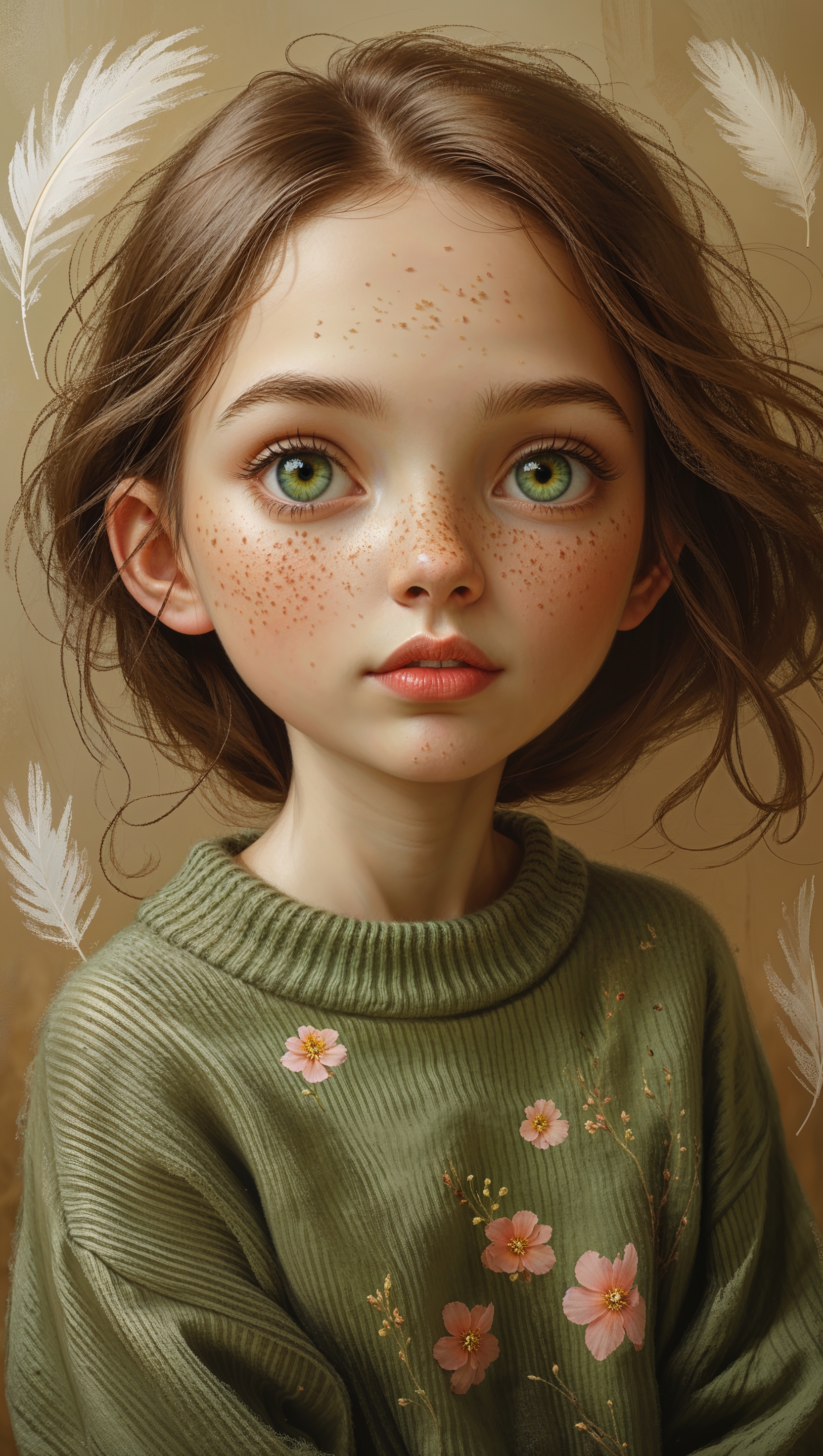 1664x2944 Painterly style girl with freckles, oversized sweater, soft brush strokes