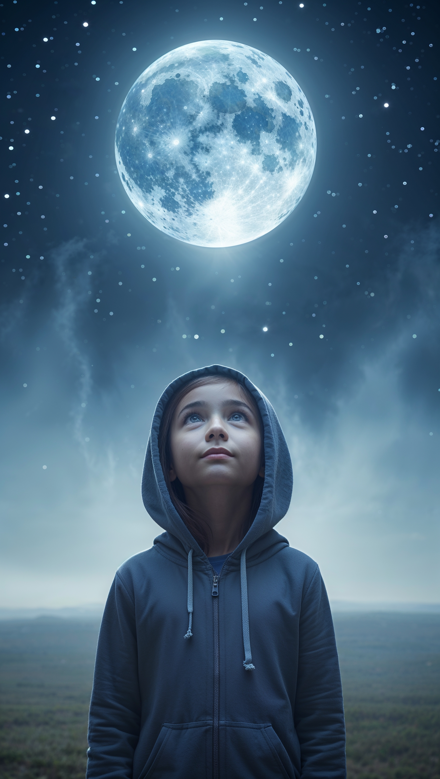 1664x2944 Young girl in a hoodie looking up at the stars, with glowing moon above