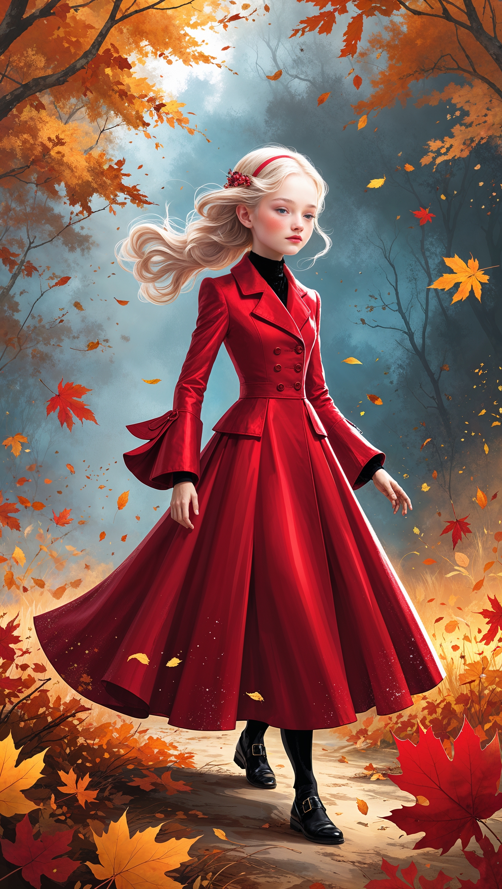 1664x2944 Elegant fashion illustration of girl in red coat walking in autumn leaves