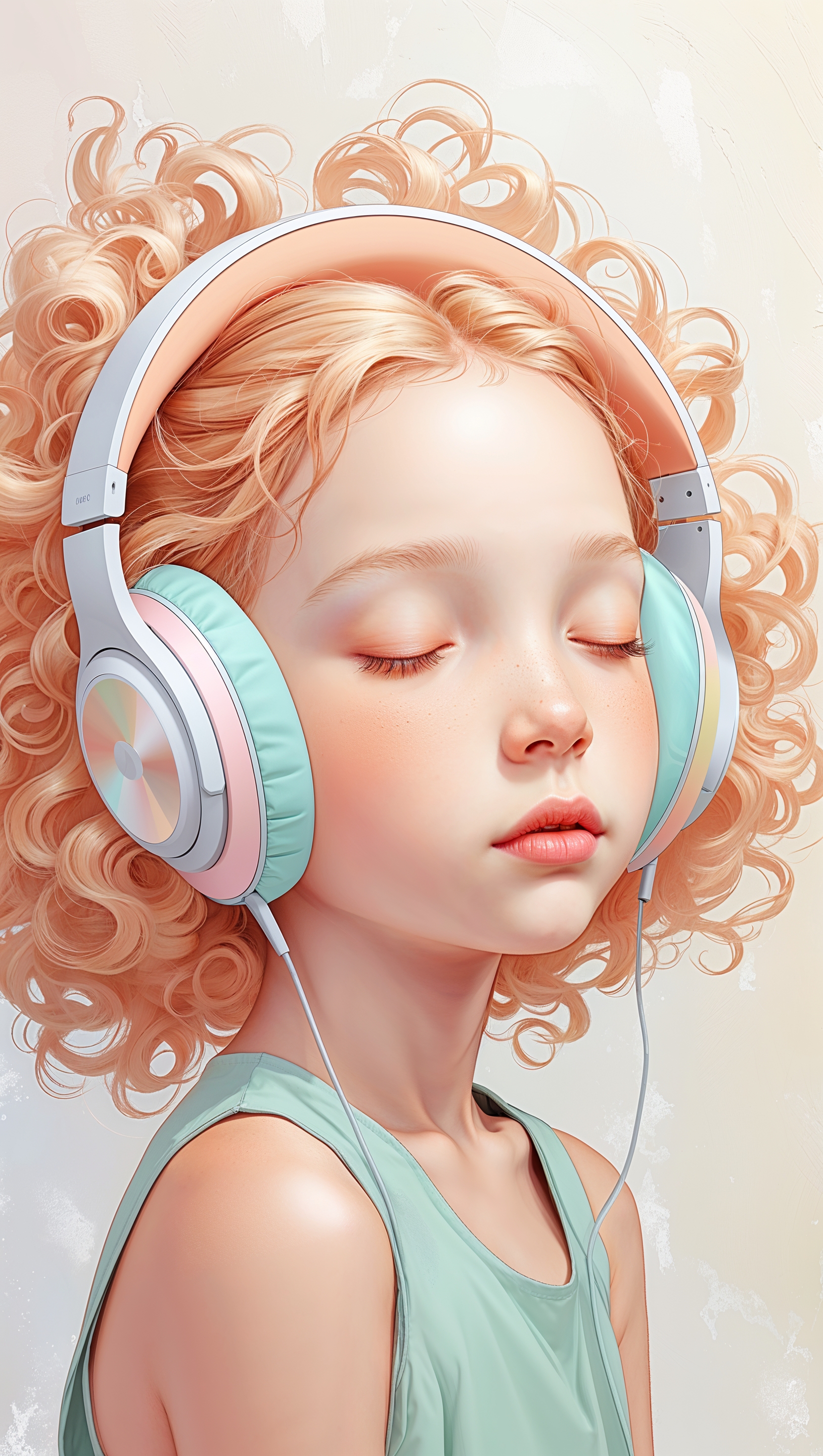1664x2944 Flat digital art of girl wearing headphones, lost in music, soft pastels