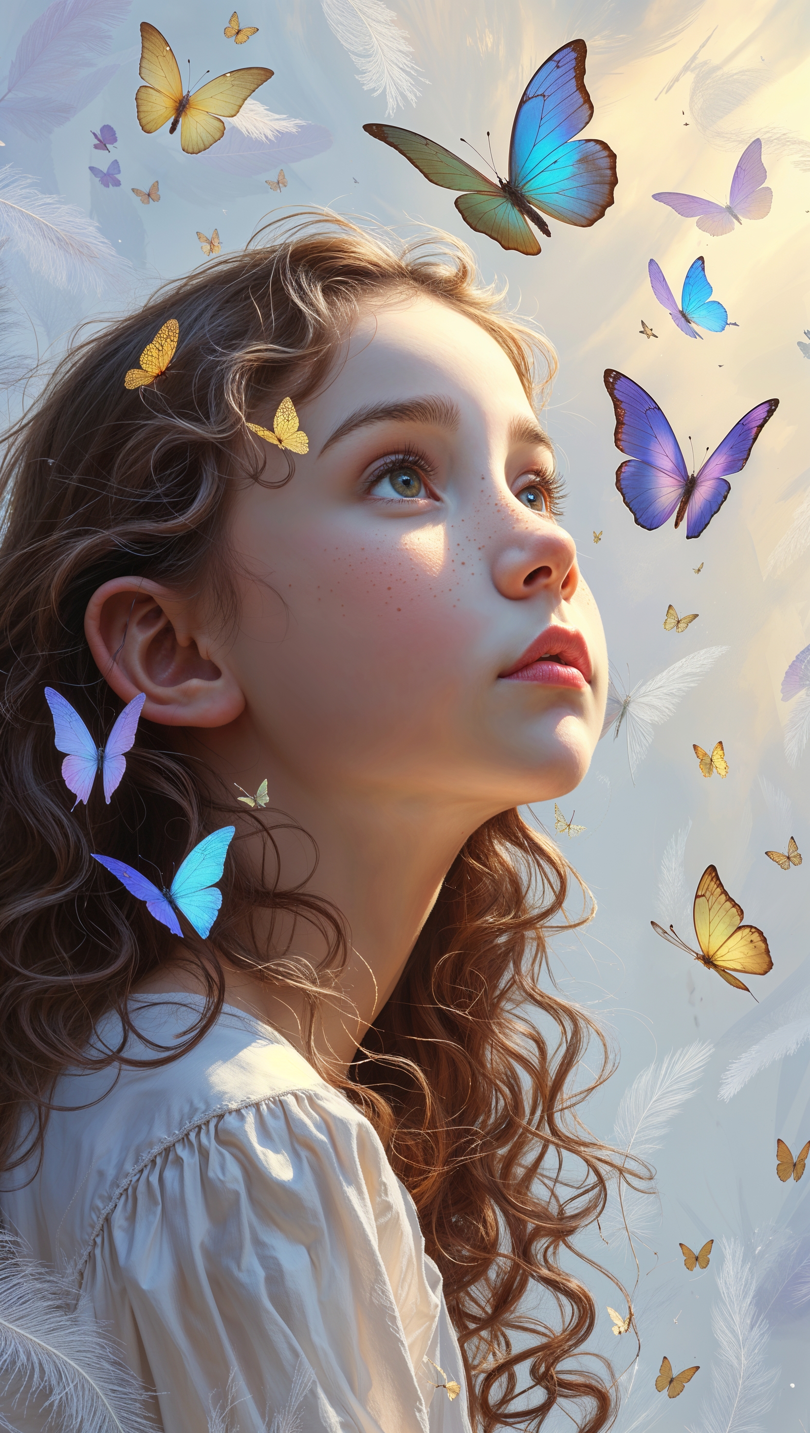 1664x2944 Profile view of a dreamy girl surrounded by floating butterflies