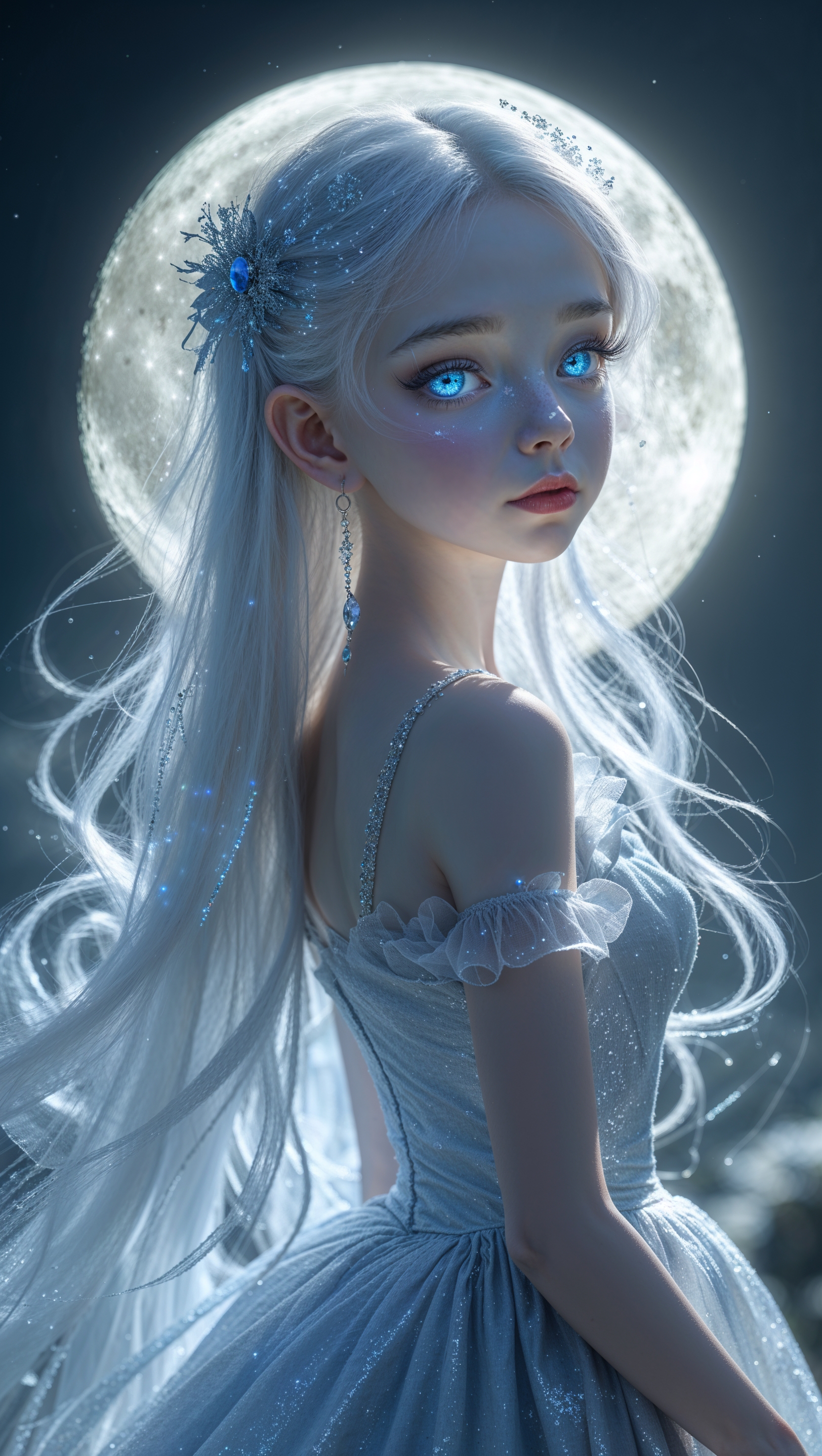 1664x2944 Fantasy girl with glowing blue eyes and long silver hair under moonlight