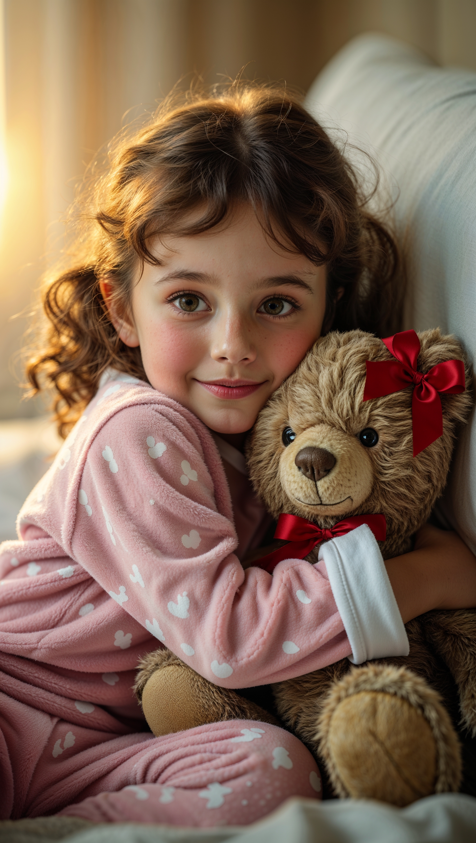 1664x2944 Girl in bunny pajamas hugging a stuffed animal, soft bedroom light