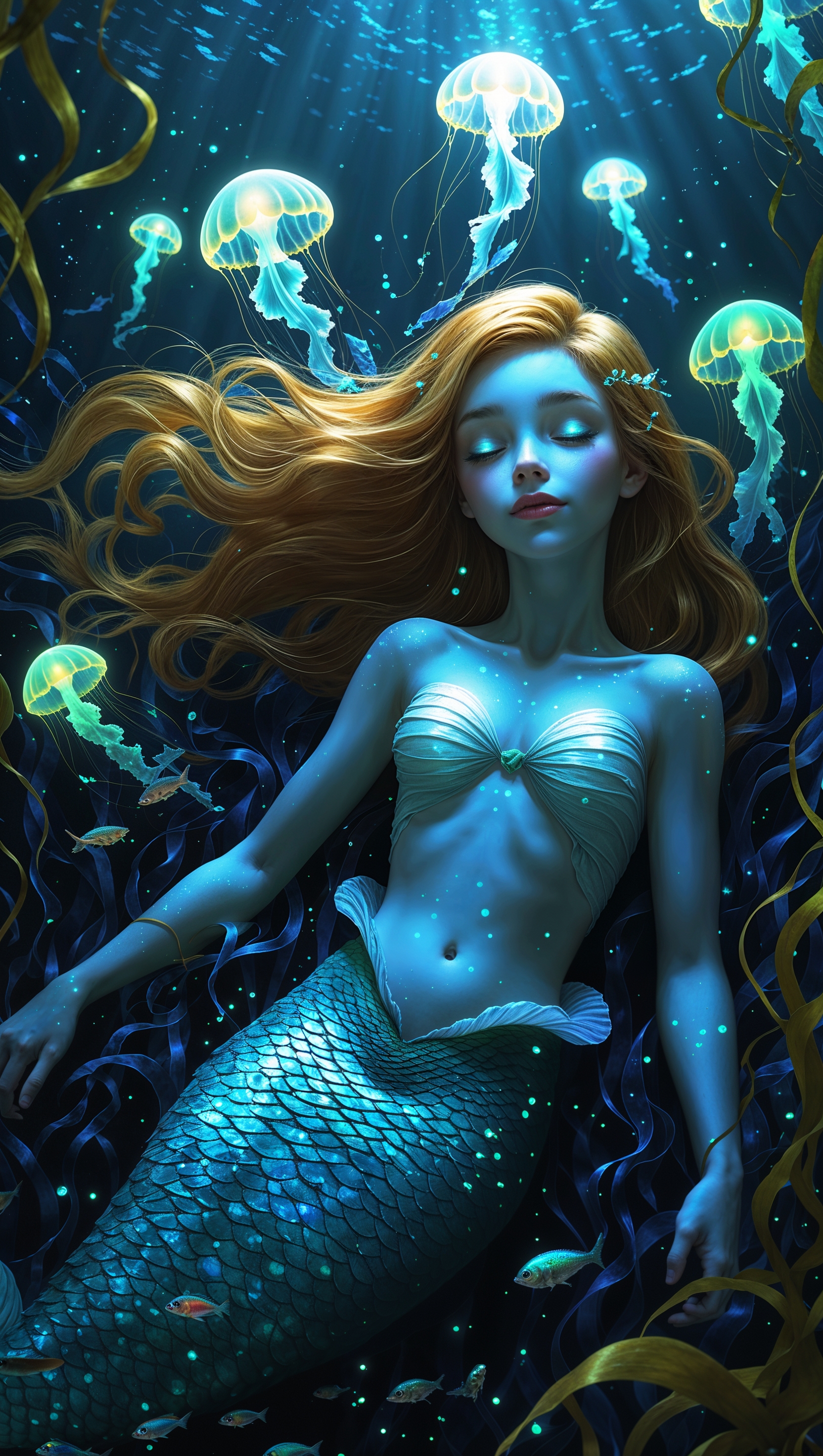 1664x2944 Mermaid girl under water, surrounded by glowing jellyfish