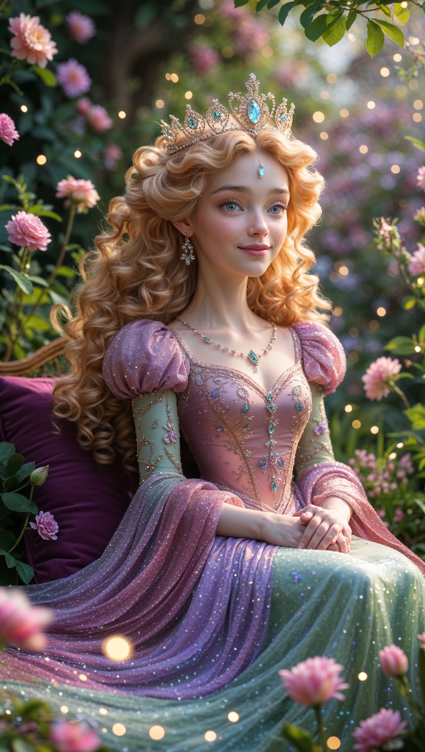 1664x2944 Princess girl sitting in garden with a small crown and sparkly dress