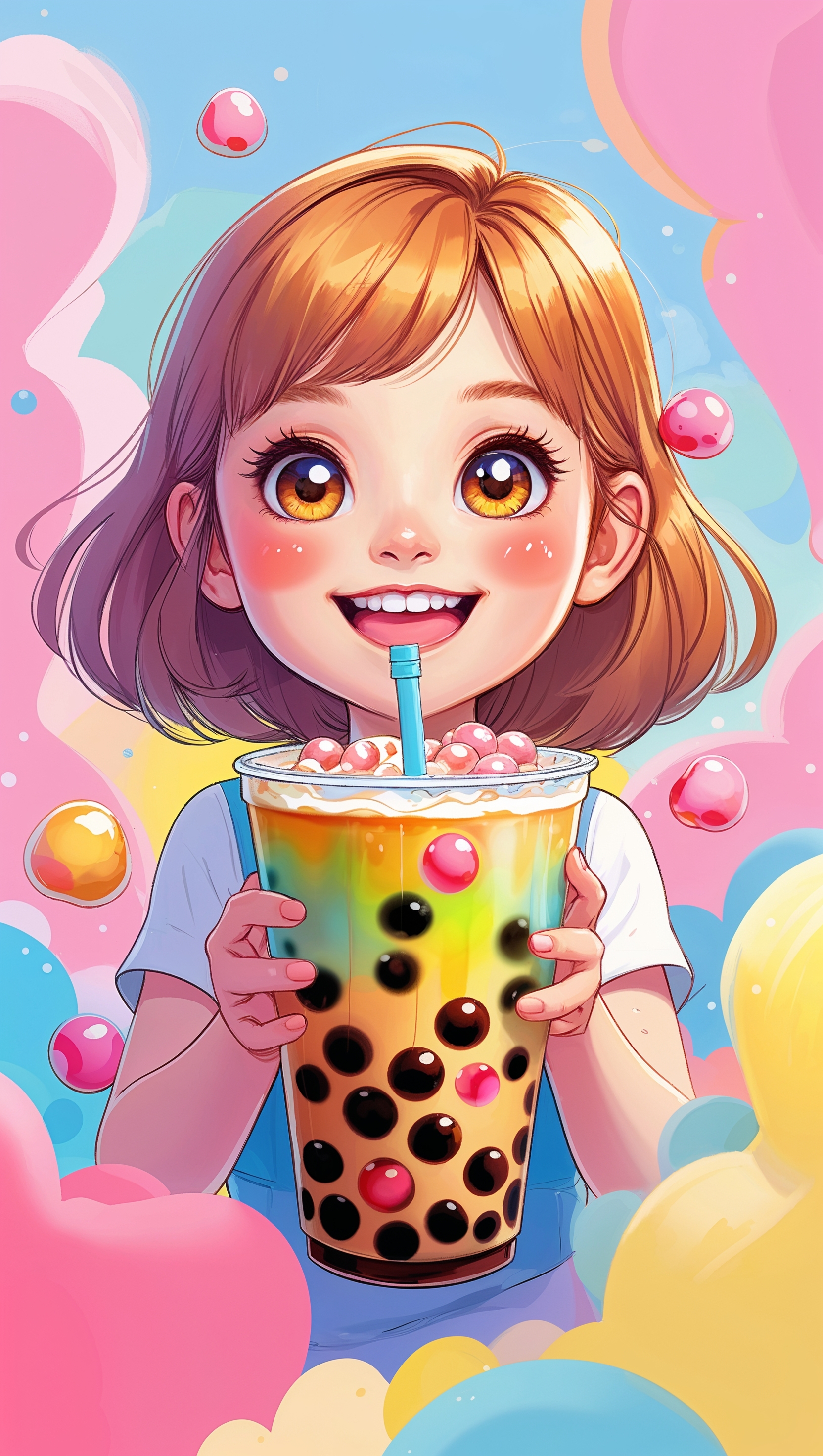 1664x2944 Cute chibi-style girl drinking boba tea with bright smile