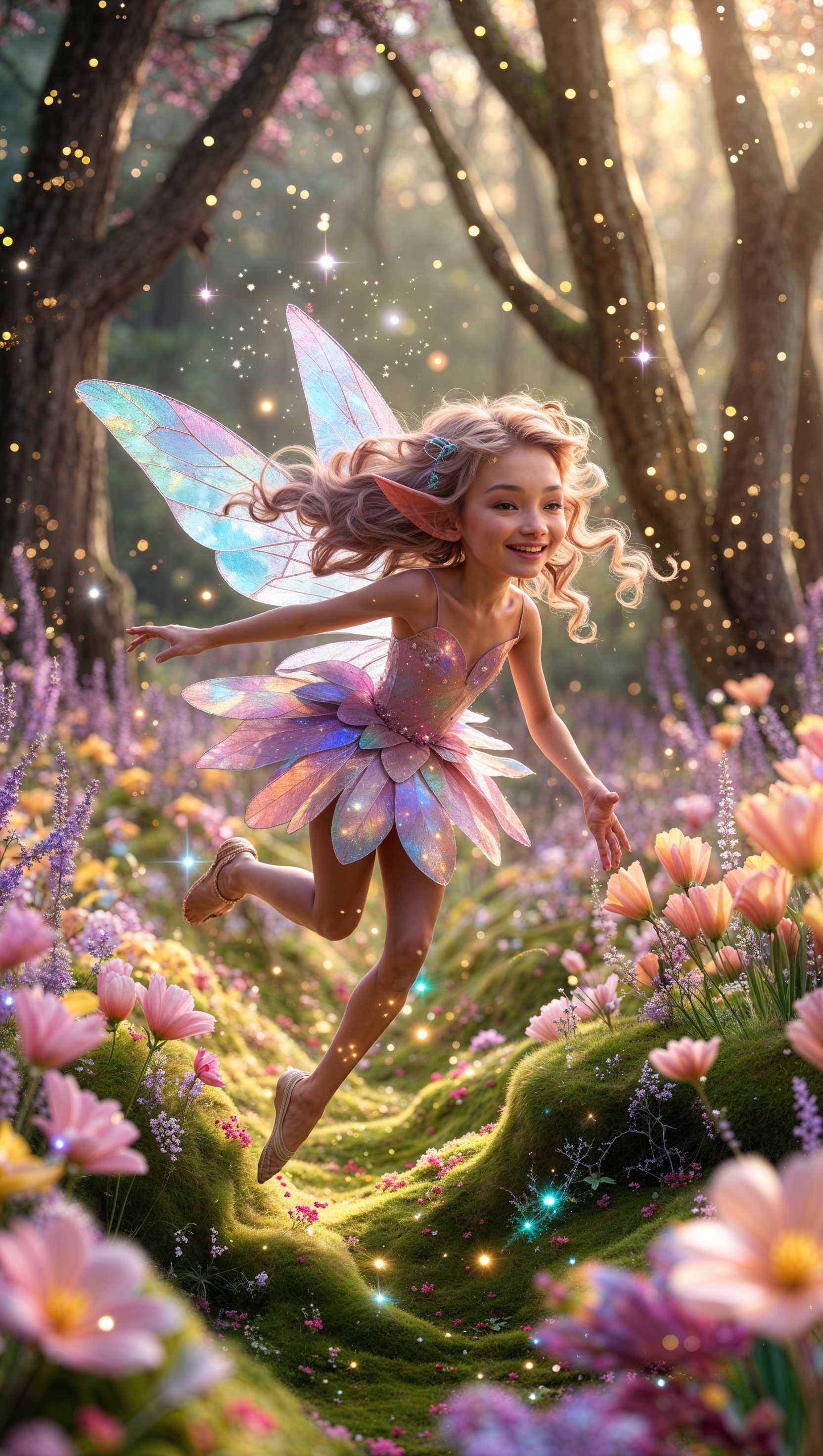 1664x2944 Fairy girl flying through a flower forest trail, sparkles and wings glowing