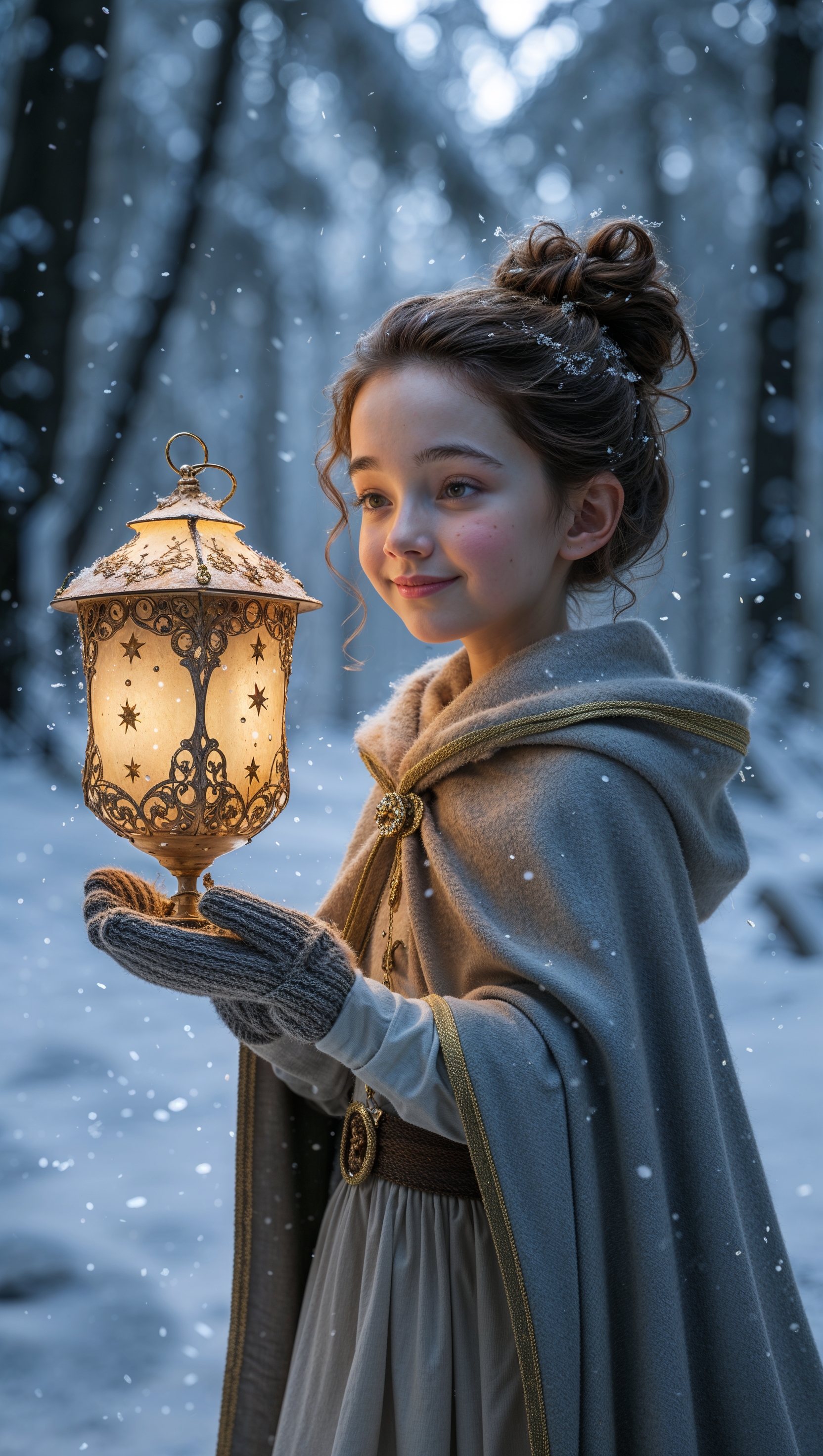 1664x2944 Girl with magical lantern walking through snow-covered forest