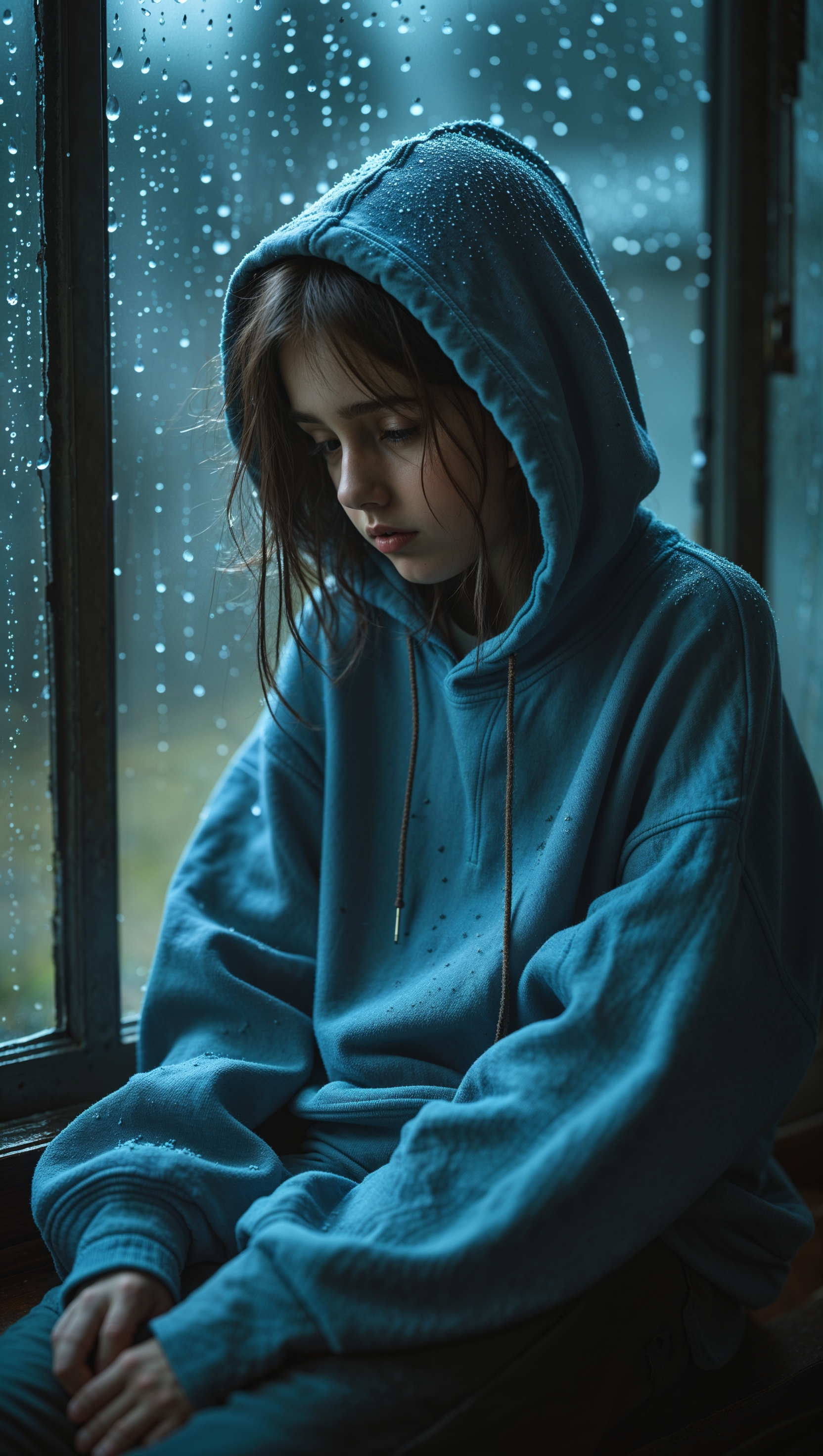 1664x2944 Sad girl with hoodie sitting by rainy window, soft lighting and mood