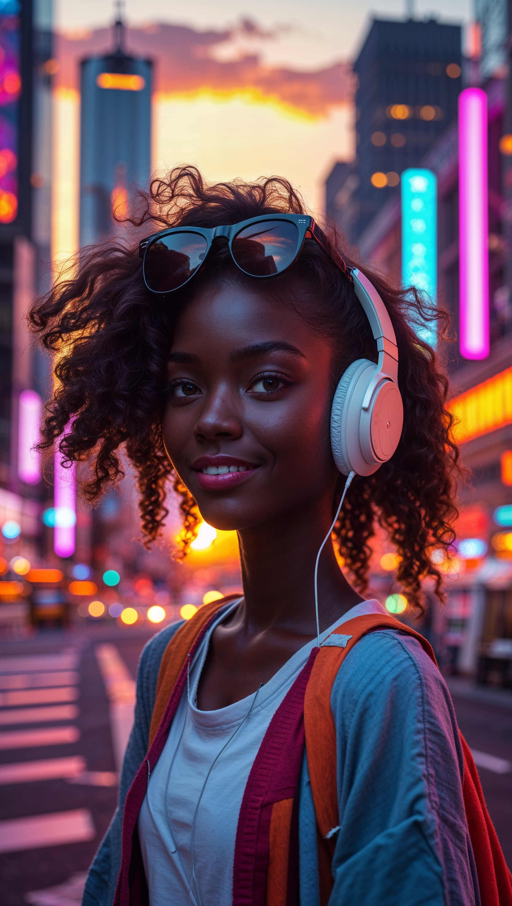 1664x2944 Urban girl with sunglasses and headphones walking in city at sunset