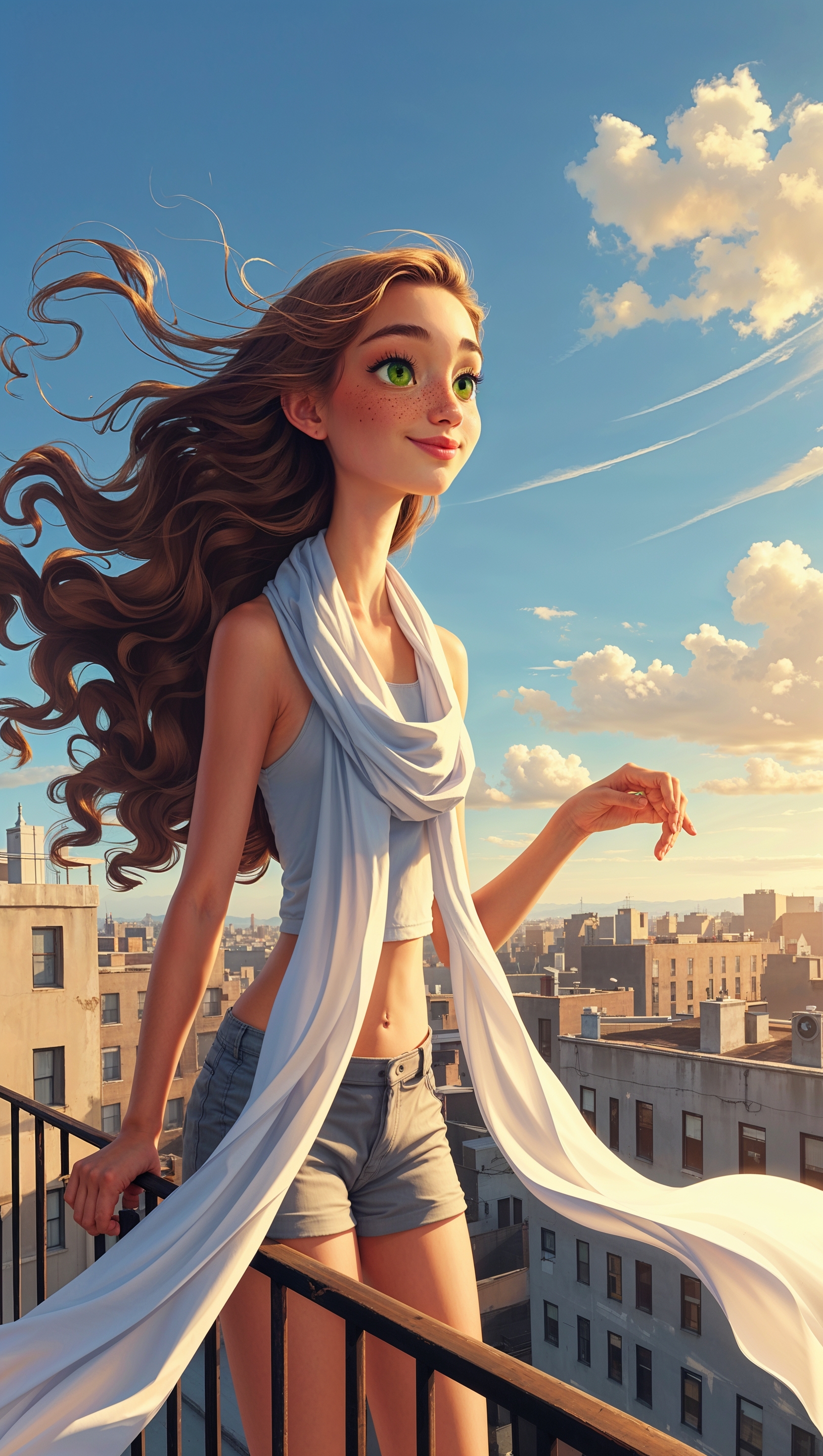 1664x2944 Vertical photo of girl standing on rooftop with flowing scarf in wind