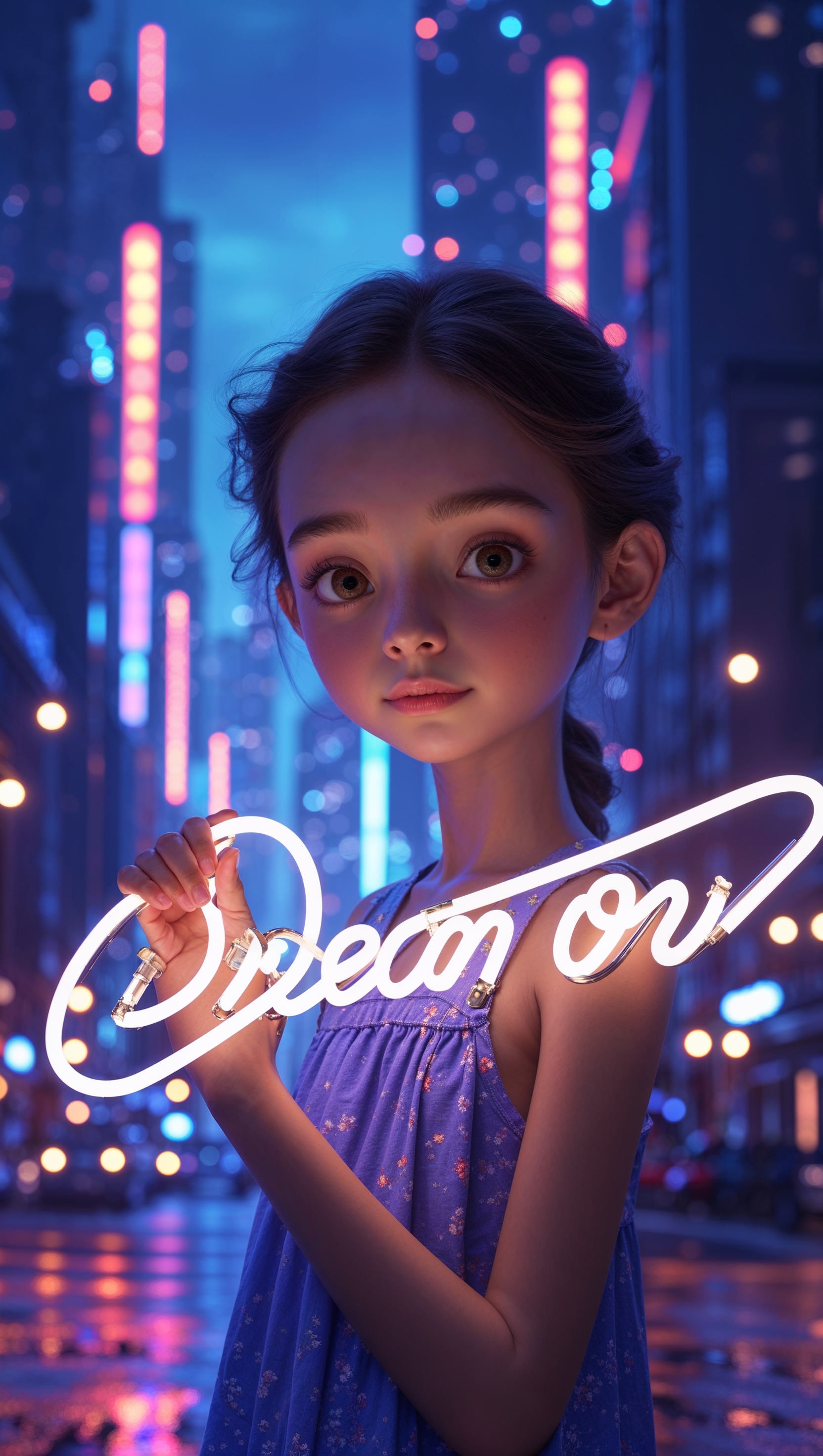 1664x2944 Girl holding glowing neon sign that reads “dream on”, night background