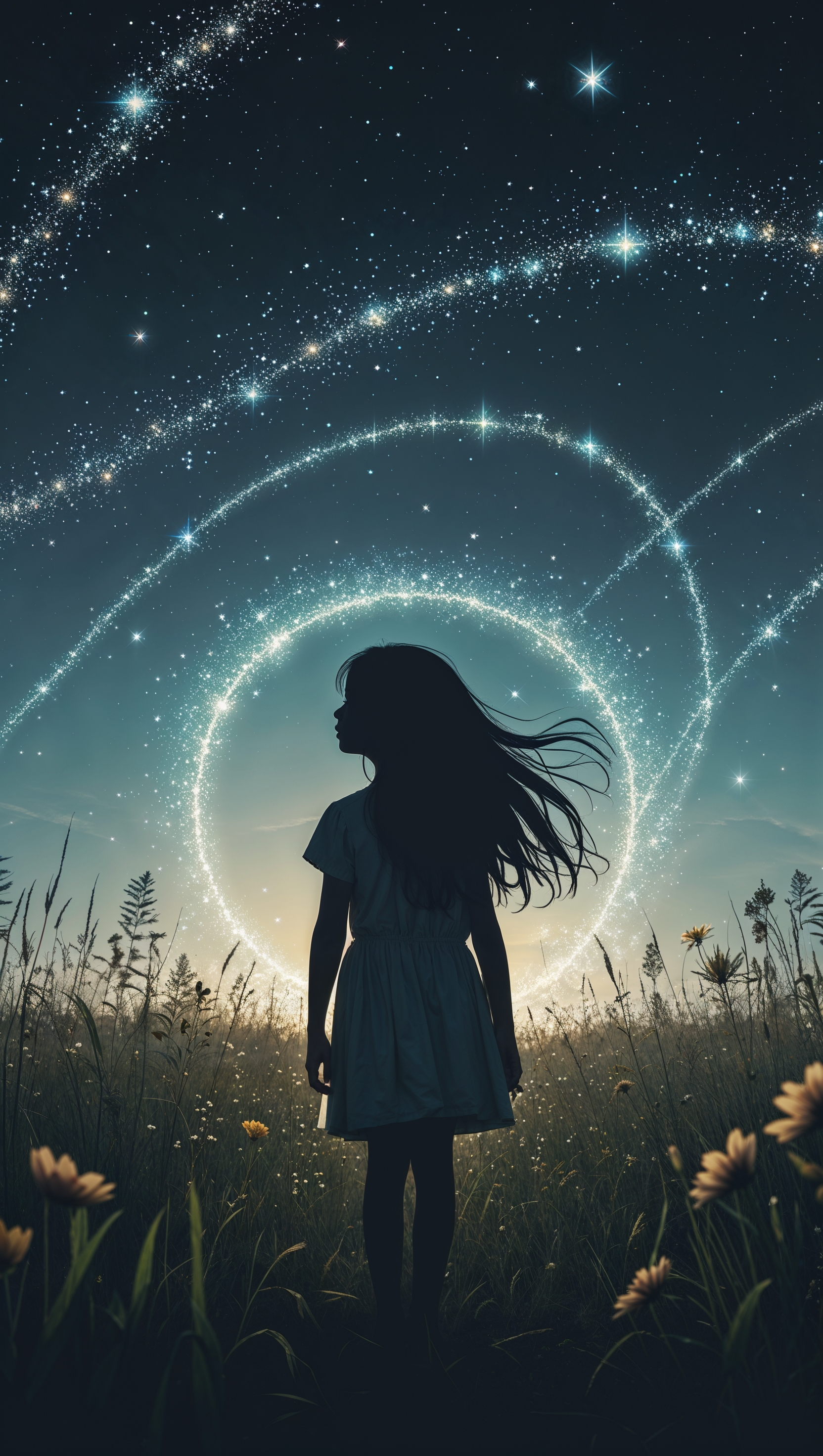 1664x2944 Backlit silhouette of girl standing in field with stars forming a halo