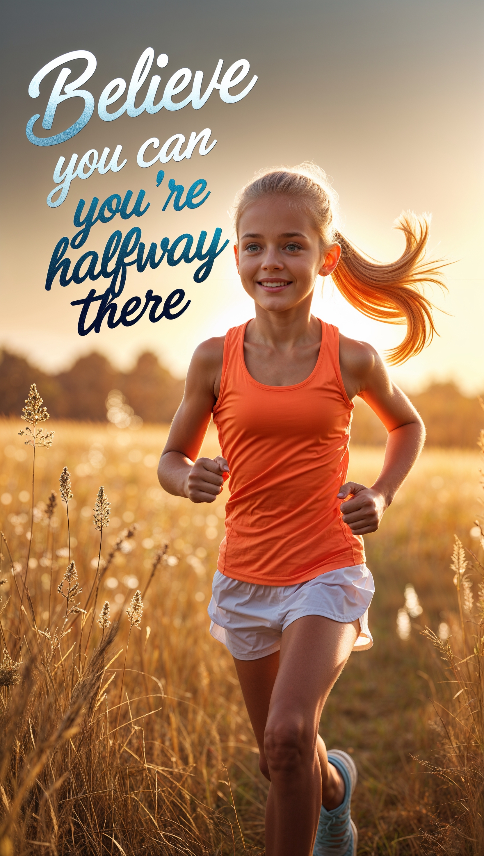 1664x2944 Motivational quote with girl running through sunrise-lit field