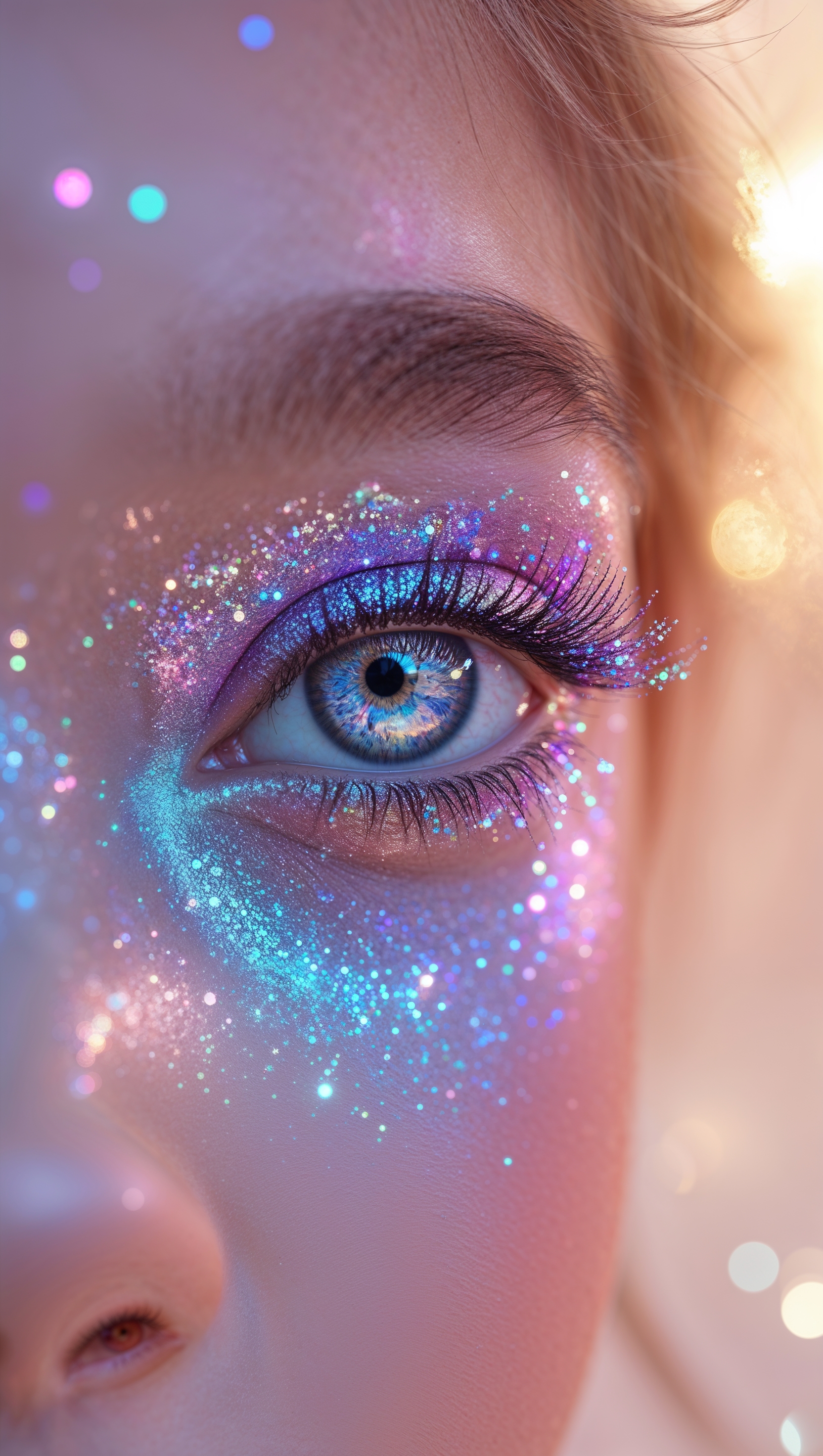 1664x2944 Close-up of girl’s eyes with glitter makeup and soft-focus background